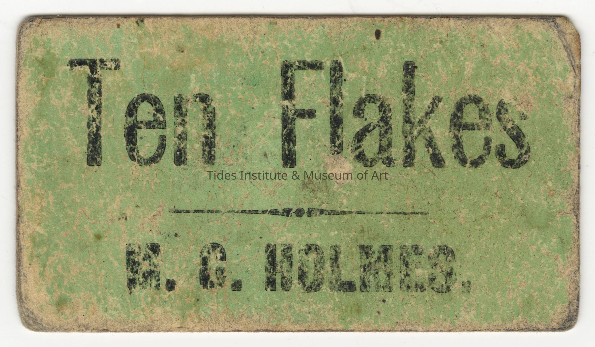 Ten Flake Ticket, M.C. Holmes Sardine Factory, Eastport, Maine, c.1890. Printed on cardboard like material. Size: 2 5/8" wide x 1 1/2" high. Given to Hugh French by John Pike Grady at Ruthella's Beauty Shop, Water Street, Eastport, Maine on February 19, 1980. The ticket had been given to John Pike Grady by Burt Wilson of Eastport, Maine several years before. Burt Wilson estimated at the time that the ticket was 75 or more years old.