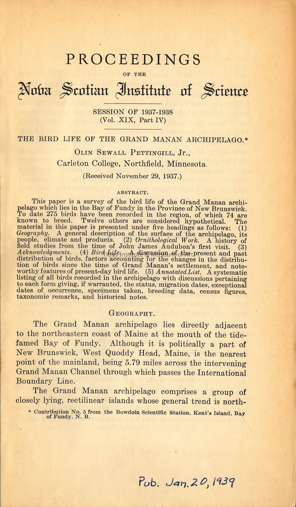 Proceedings of the Nova Scotian Institute of Science, Session of 1937-1938 (Vol. XIX, Part IV).