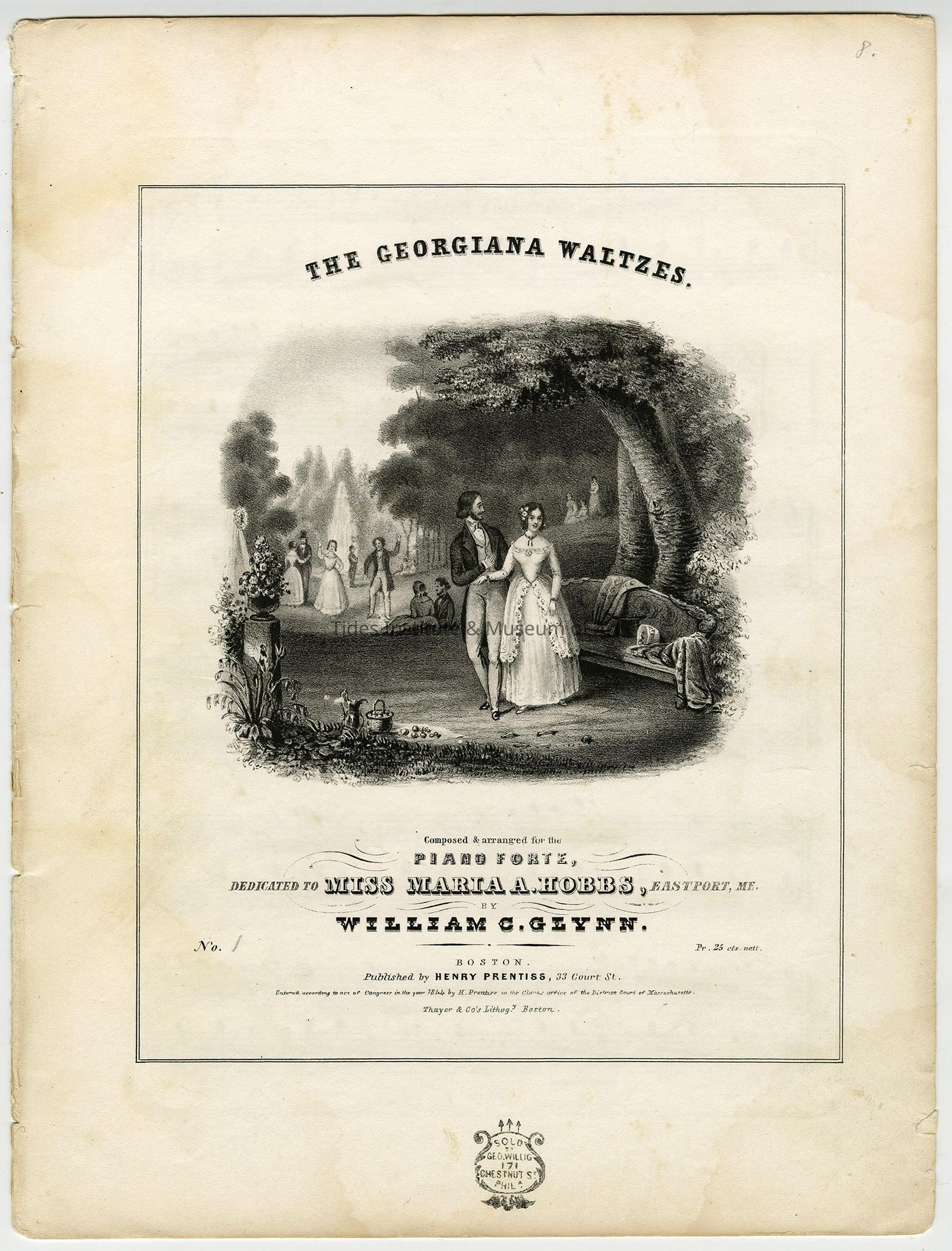 The Georgiana Waltzes. Composed & arranged for the Piano Forte, Dedicated to Miss Maria A. Hobbs, Eastport, Me by William C. Glynn. No. 1. Pr. 25 cts nett. Boston. Published by Henry Prentiss, 33 Court St., Entered according to act of Congress in the year 1844 by H. Prentiss in the Clerk's office of the District Court of Massachusetts. Thayer & Co.' Lithog'y. Boston.