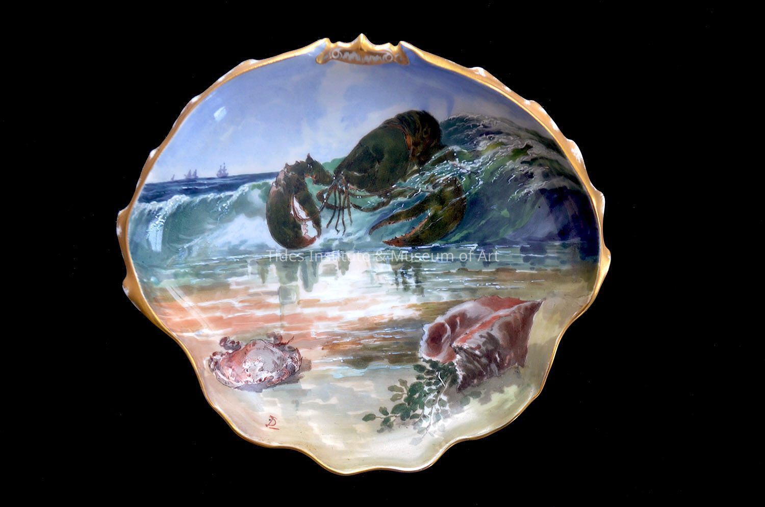 A Seafood Plate from the Rutherford B. Hayes Presidential Service, 1879–1880, with a design on the front that could well be a Maine coastal scene complete with lobster and crab. The plate was a gift to the Tides Institute. The plate is made of porcelain with enamels and gilding. It is part of very large and remarkable specially commissioned porcelain state dinner service set that was made for the White House by Haviland Company of New York City and Limoges of France. Originally, the First Lady and wife of President Hayes had intended to have floral patterns, drawn from plants in the White House conservatory, serve as designs on the porcelain service pieces. But a chance meeting in the conservatory between her and Theodore Davis, an illustrator and journalist for Harper’s Weekly, changed matters. Davis suggested that the First Lady use depictions of flora and fauna native to North America, thus celebrating the naturalistic bounty of the country. The First Lady agreed. She commissioned Davis as the designer and he produced 130 distinct decorations for the 562 pieces made for nine courses. Each decoration was drawn by hand, etchings were made to transfer the outlines, basic colors were applied via chromolithographic and decalcomania processes, and lastly enamel details and gilding were added by hand.