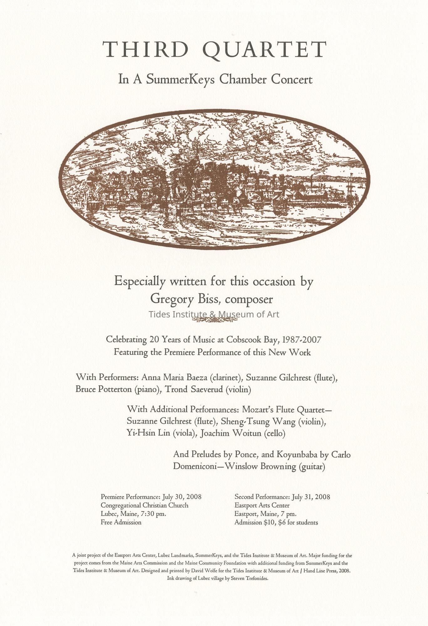 A joint project of the Eastport Arts Center, Lubec Landmarks, SummerKeys, and the Tides Institute & Museum of Art. Major funding for the project comes from the Maine Arts Commission and the Maine Community Foundation with additional funding from SummerKeys and the Tides Institute & Museum of Art. Designed and printed by David Wolfe for the Tides Institute & Museum of Art / Hand Line Press, 2008. Ink drawing of Lubec village by Steven Trefonides.
