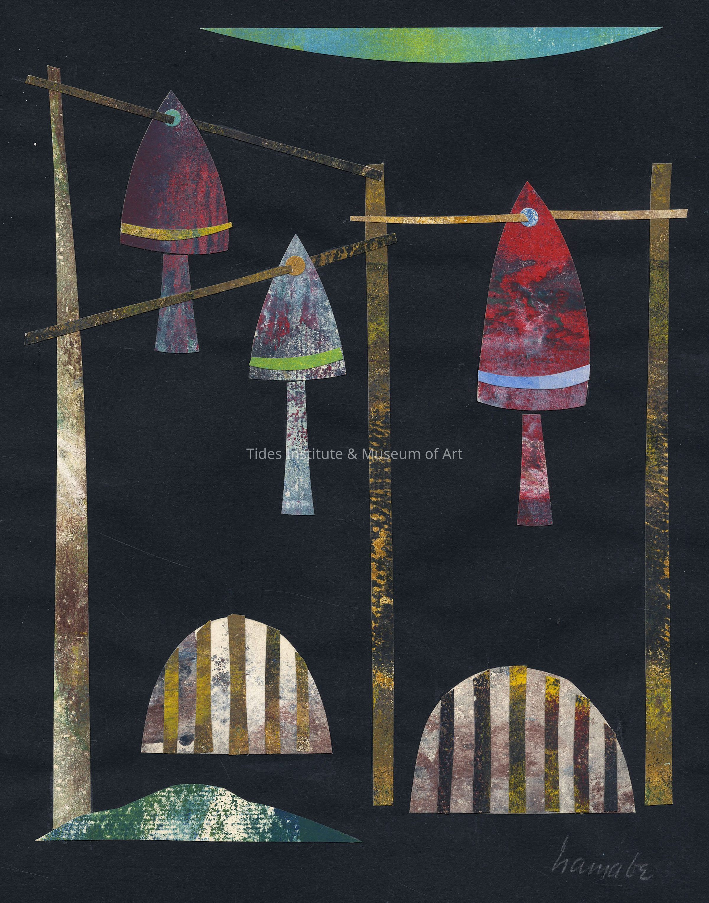 TRAPS & BUOYS! FRANCIS HAMABE! "Traps and Buoys," that's the title of this cut paper collage by artist, Francis Hamabe (American, 1917-2002), in our collections. We're guessing the collage dates to about 1970. Measuring 9 1/4" x 7 1/4", the collage was a gift to the Tides Institute from the estate of the late museum curator and collector, Christopher Monkhouse, who long summered in Machiasport, Maine.