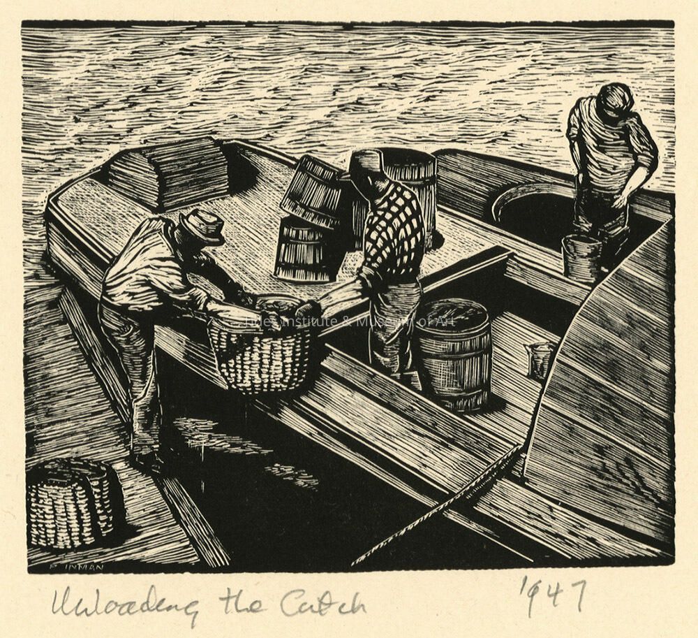 Pauline Winchester Inman (1904–1990) | Unloading the Catch | Wood Engraving | 1947Description