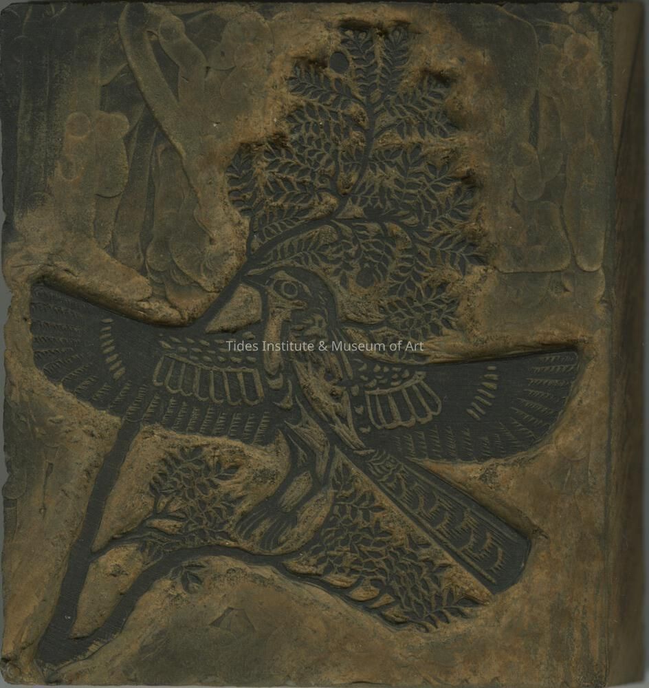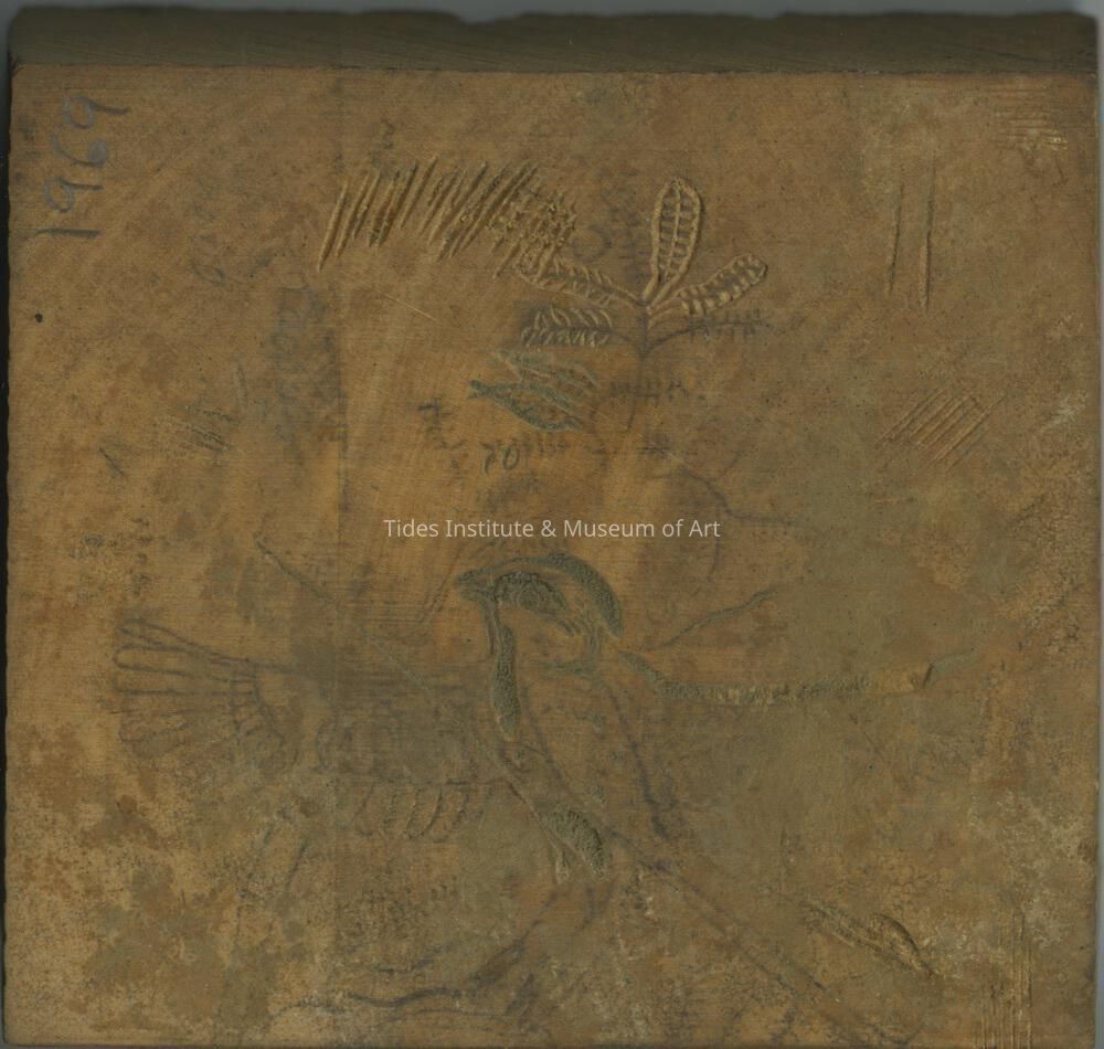 Artist: Pauline Inman Medium: Woodblock Old Accession Number: 1969 Description: Rough carving of same bird on back of block.