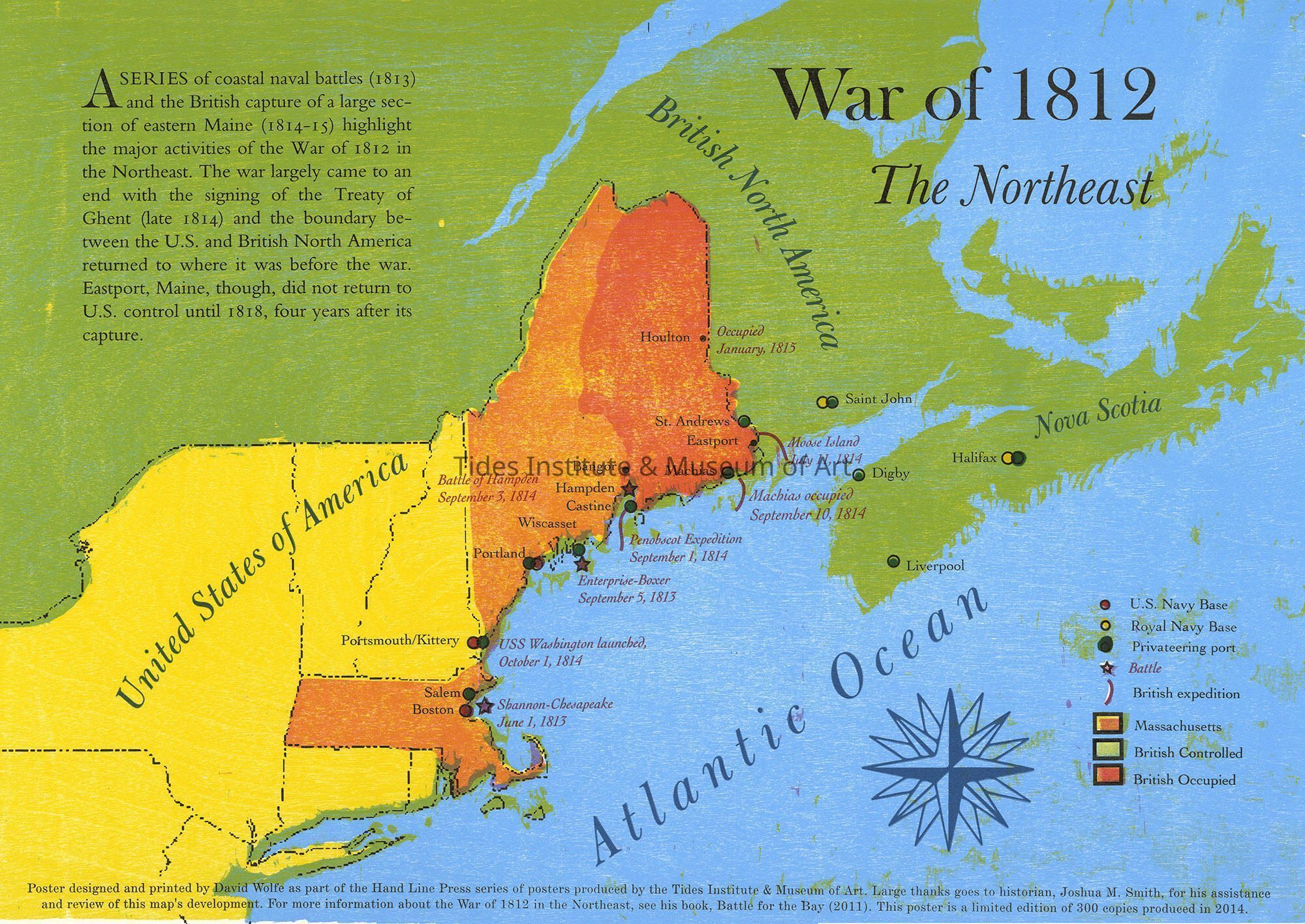 Poster designed and printed by David Wolfe as part of the Hand Line Press series of posters produced for the Tides Institute & Museum of Art. Large thanks go to historian, Joshua M. Smith, for his assistance and review of this map's development. For more information about the War of 1812 in the Northeast, see his book, Battle for the Bay (2011). This poster is a limited edition of 300 copies produced in 2014.