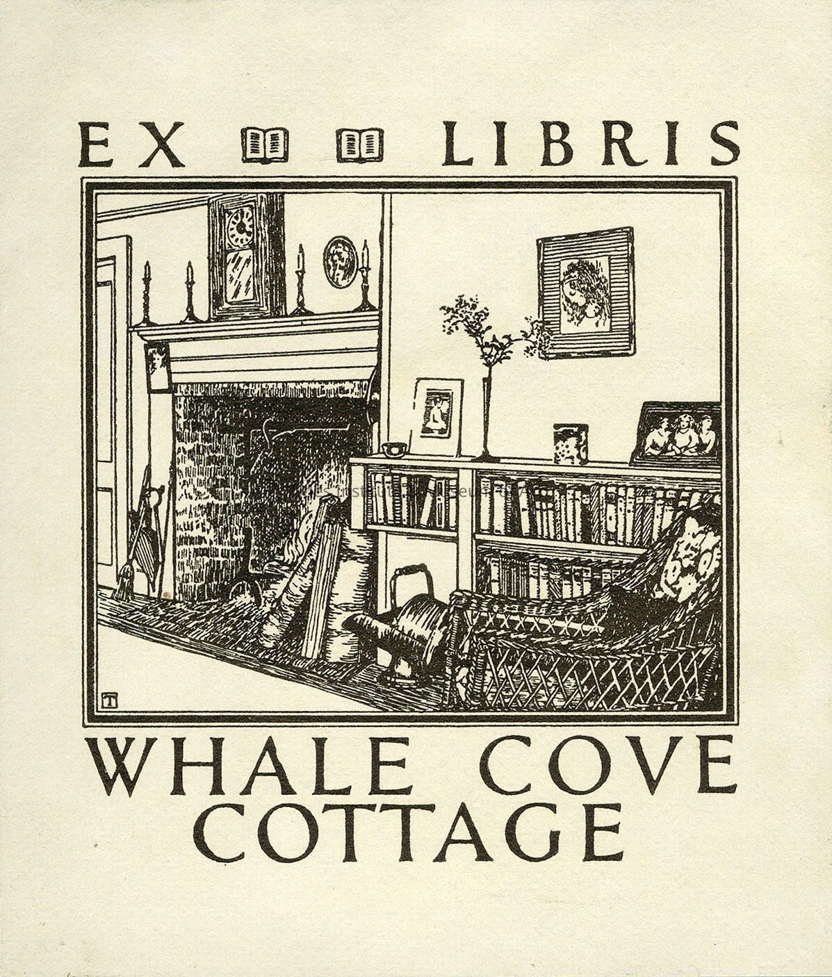 An original “Ex Libris” bookplate for Whale Cove Cottage on Grand Manan Island in New Brunswick. This was the cottage that noted American writer, Willa Cather, and her companion, Edith Lewis, had built for themselves in 1927 by local carpenters. The bookplate contains an interior view of their comfortable and cozy looking cottage complete with fireplace, shelf clock sitting above on the fireplace mantle, a low bookcase to one side of the fireplace full of books and a comfortable wicker chair beside the fireplace and bookcase for sitting in. The bookplate is adhered to the inside cover of a book in the collections of the Tides Institute and it may have come from the personal library of Willa Cather and perhaps was one of the books in the bookcase shown in the bookplate scene of the cottage. Willa Cather first came to Grand Manan with Edith Lewis in 1922 and rented “Orchardside,” one of the Whale Cove Cottages that still exist today, as does their own cottage that they later had built nearby. Cather was working on her novel, “A Lost Lady,” when she spent that first summer on Grand Manan. She and Lewis would return to Grand Manan each of the following summers for nearly 20 years. Cather wrote only one story clearly set on Grand Manan. This is the story, “Before Breakfast,” found within a book collection of her stories, “The Old Beauty and Others,” published after her death in 1948 in which she describes in detail her Whale Cove Cottage and surrounding trails. But clearly Whale Cove Cottage and Grand Manan provided Cather with the time and space to work and write on her other novels over those nearly 20 years. She spent her last summer on Grand Manan in 1940 as she was finishing up her last novel, “Sapphira and the Slave Girl,” published in the fall of that year. She died in 1947.