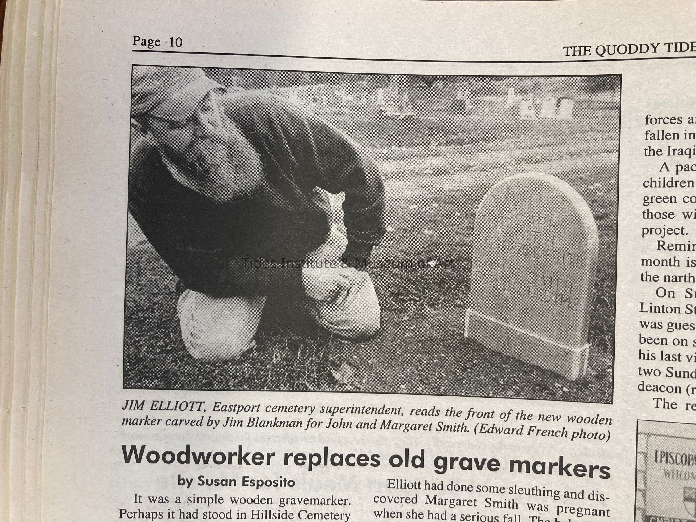 Cemetery superintendent Jim Elliott told Eastport woodcarver Jim Blankman about the Smith gravemarker, and Blankman took a look. “It was pretty much moss holding it together,” he recalls of the memorial upon which someone with a pocketknife had carved, “Margaret Smith 1870-1910” and “John H. Smith 1868-1948.” “It had rotten and fallen over.”