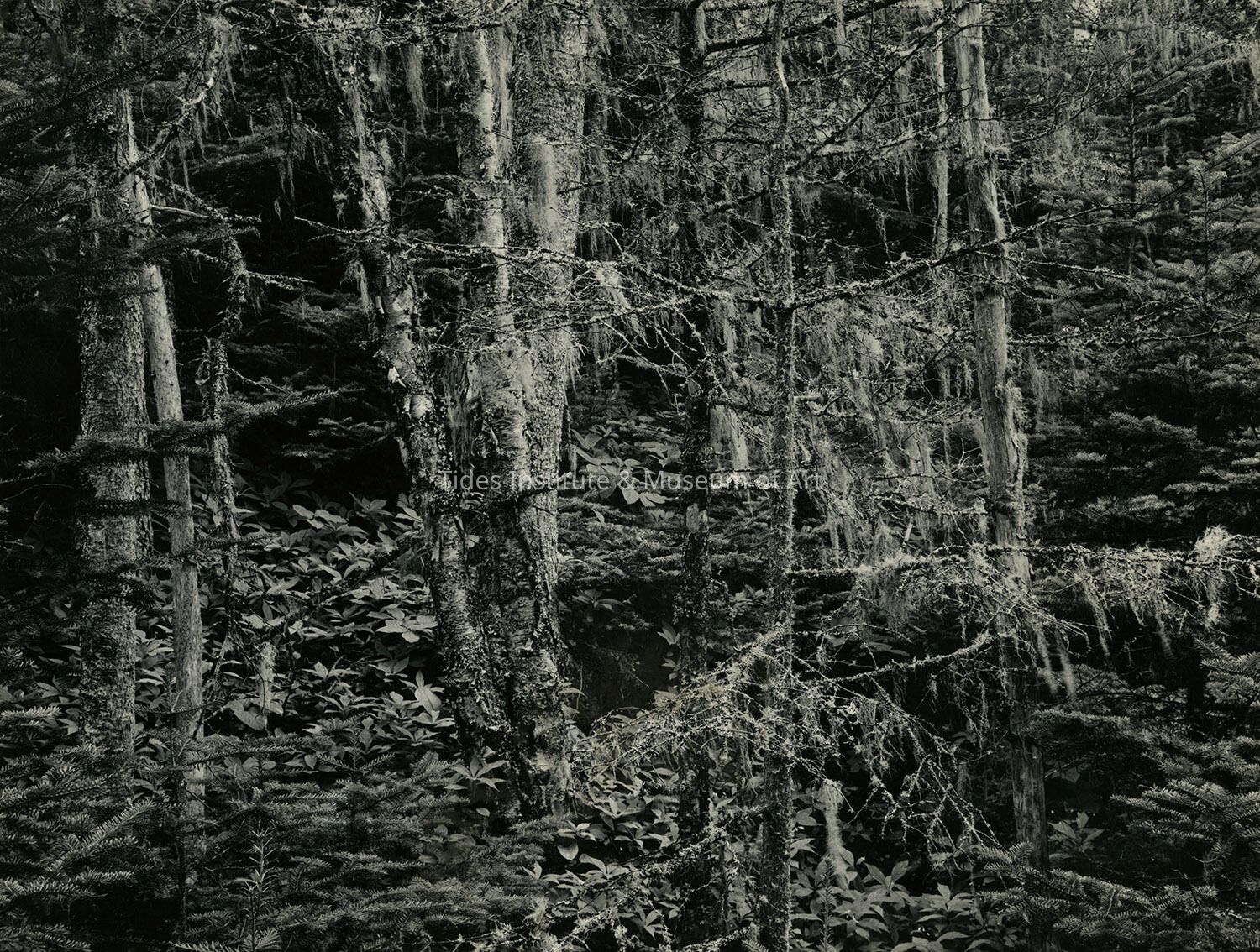 A photograph of woods in Lubec, Maine by photographer, Paul Caponigro. The photograph dates to about 1960. The Tides Institute acquired the photograph at auction in Boston after being tipped off about the photograph and auction by one of the institute’s trustees. Caponigro was part of a group of Boston based artists who visited Lubec for many years and particularly during the 1950s and 1960s. They were led there by artist, Nina Bohlen, whose family had deep ties to Lubec and had houses and land there. In addition to Caponigro and Bohlen, other Boston based artist who were part of the annual artist migration to Lubec included Hyman Bloom, Steven Trefonides, Nicholas Dean and Marie Cosindas. Caponigro was born in Boston in 1932 and studied with photographer, Minor White, and then taught photography part-time at Boston University in the 1960s. Later, for 20 years, Caponigro lived in New Mexico where he explored the landscape of the American Southwest. He is considered one of the leading landscape photographers in the United States. Caponigro’s photograph of woods in Lubec, Maine is one of two photographs by him of Lubec in the collections of the Tides Institute. The other is a landscape photograph of Raven’s Gulch that dates to 1960. The institute also has a photograph of Caponigro taken at Lubec during this same time by fellow Boston photographer and Lubec visitor, Nicholas Dean.