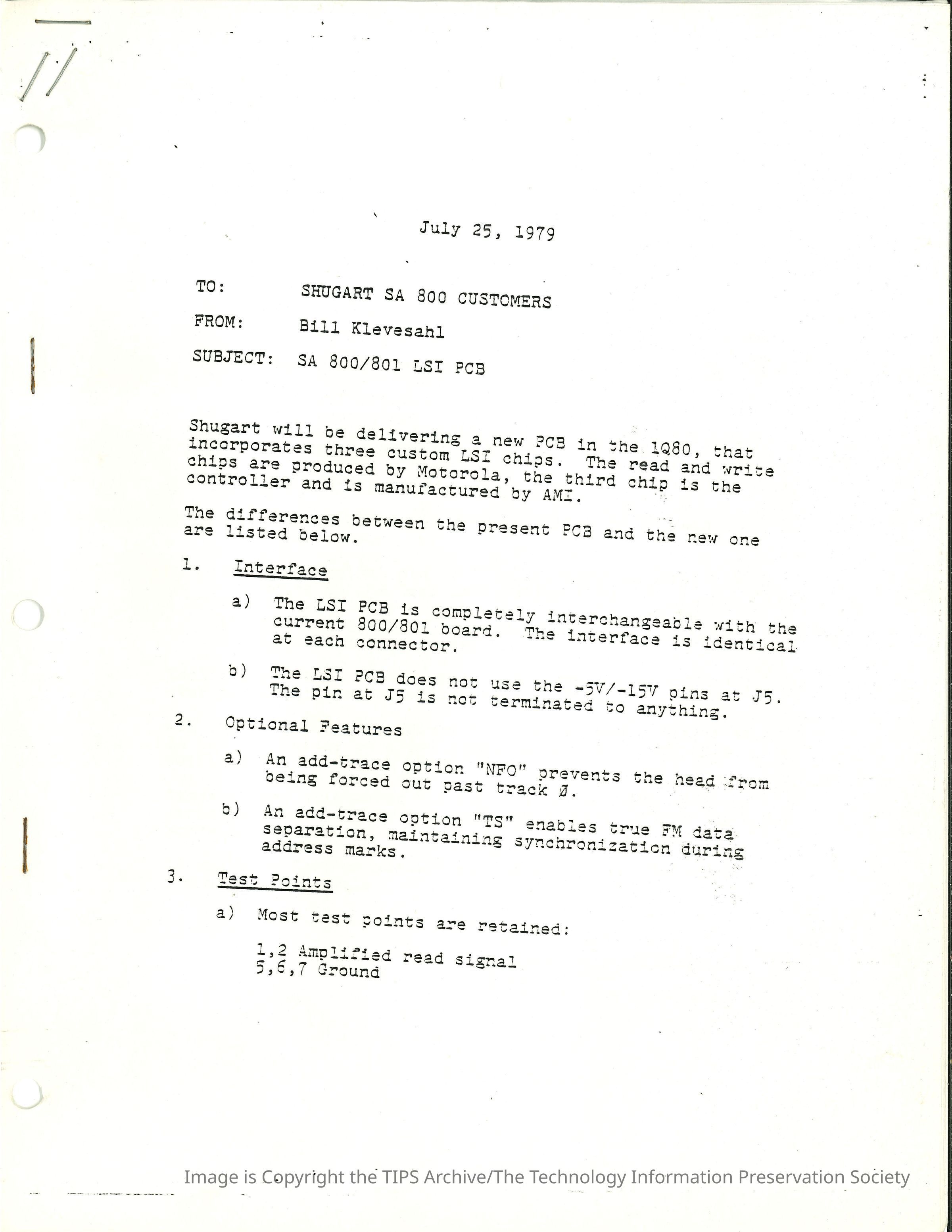 Letter to Shugart SA 800 CustomersEntry/Object ID