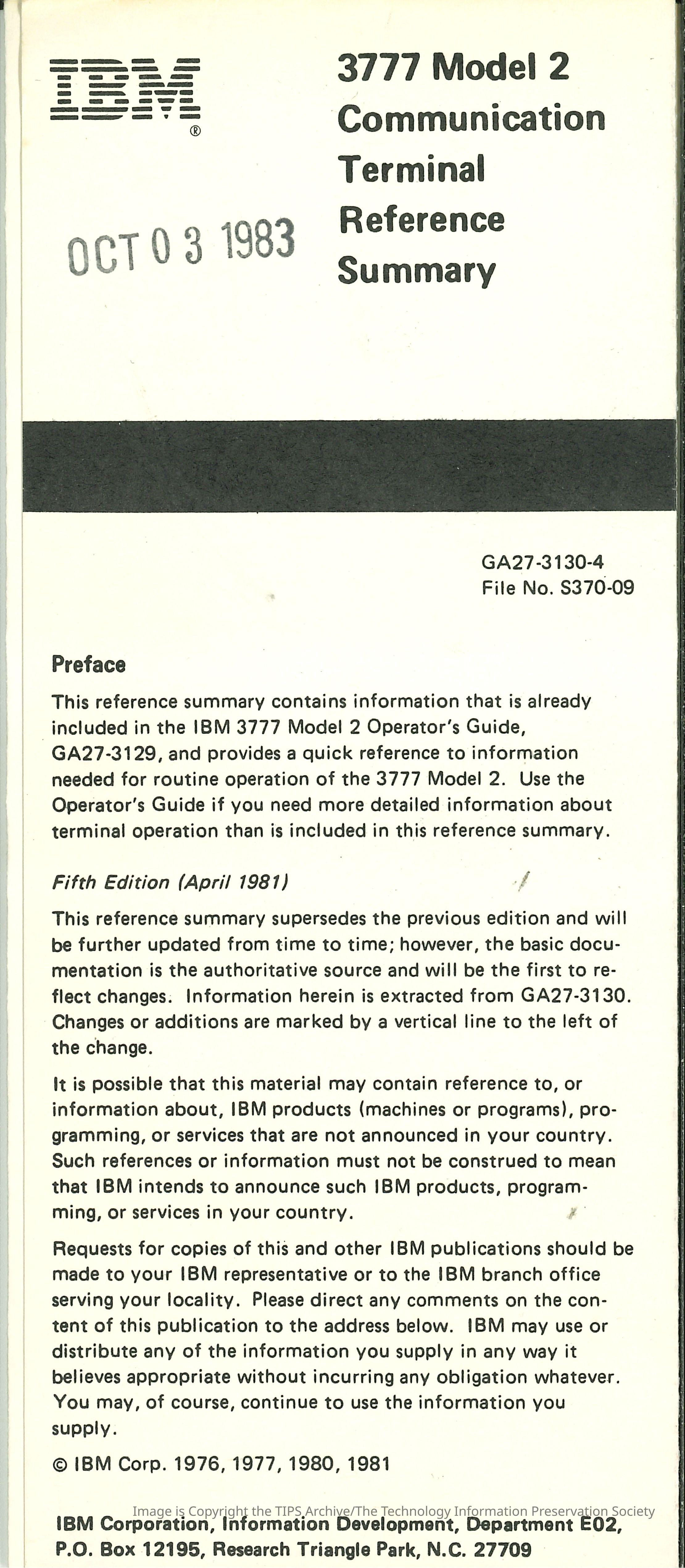 3777 Model 2 Communication Terminal Reference Summary