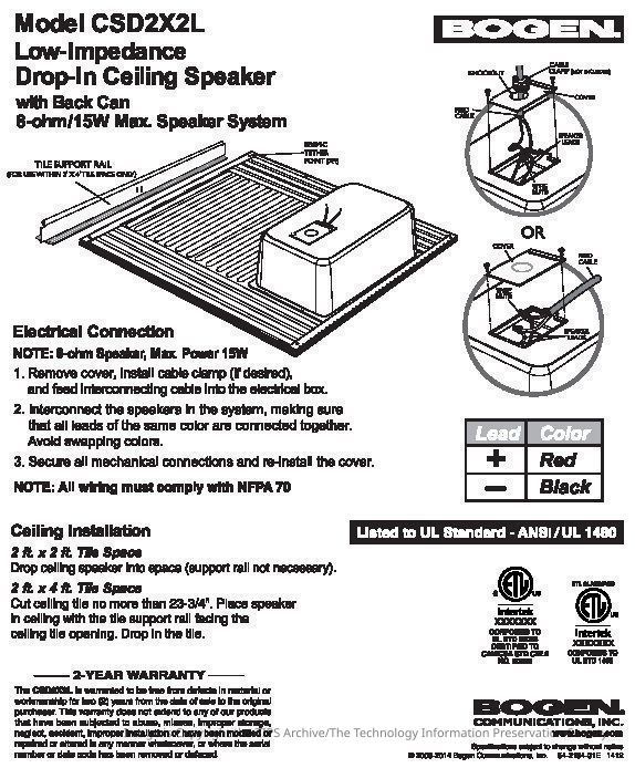 Model CSD2X2L Low-Impedance Drop-In Ceiling Speaker with Back CanEntry/Object ID