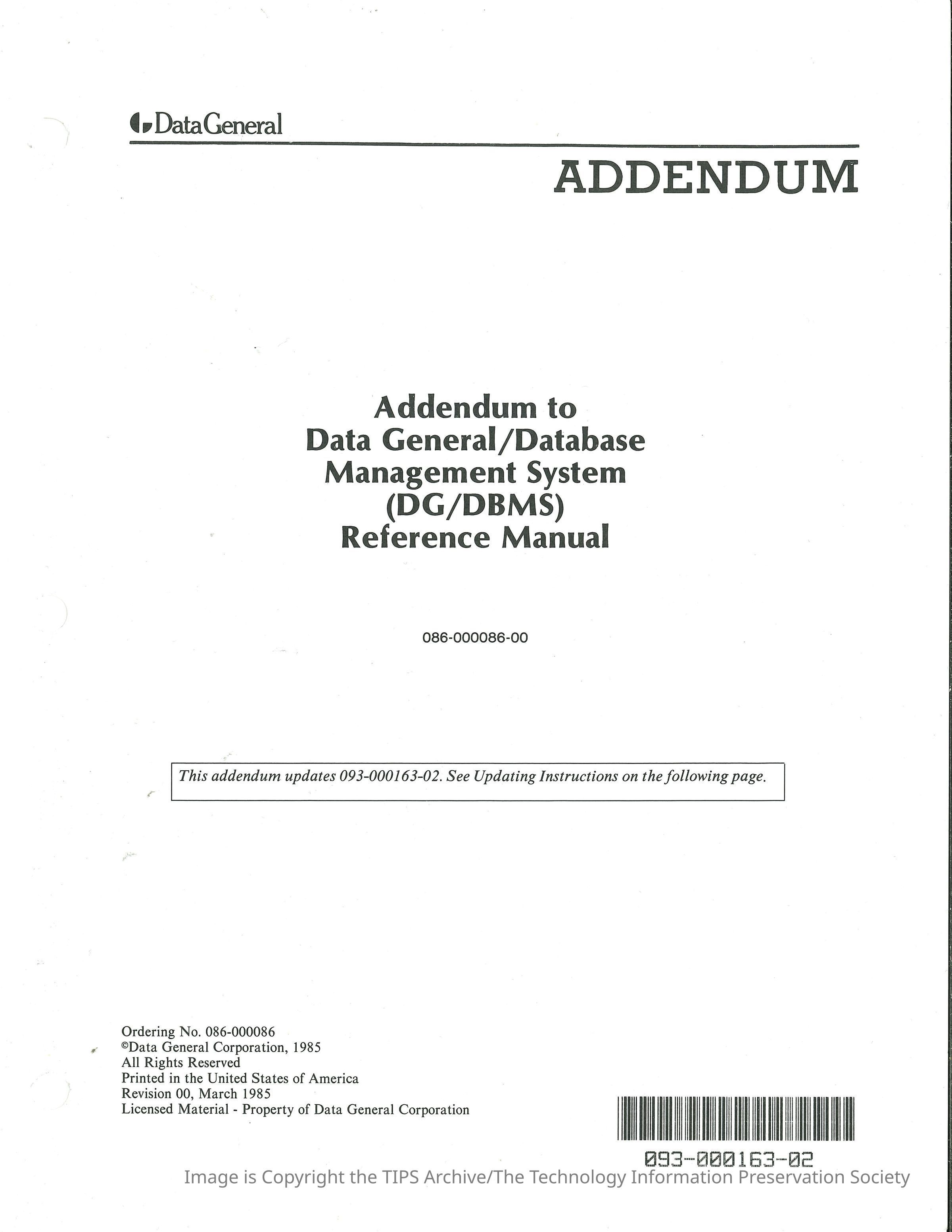 Addendum to Data General/Database Management System (DG/DBMS) Reference Manual