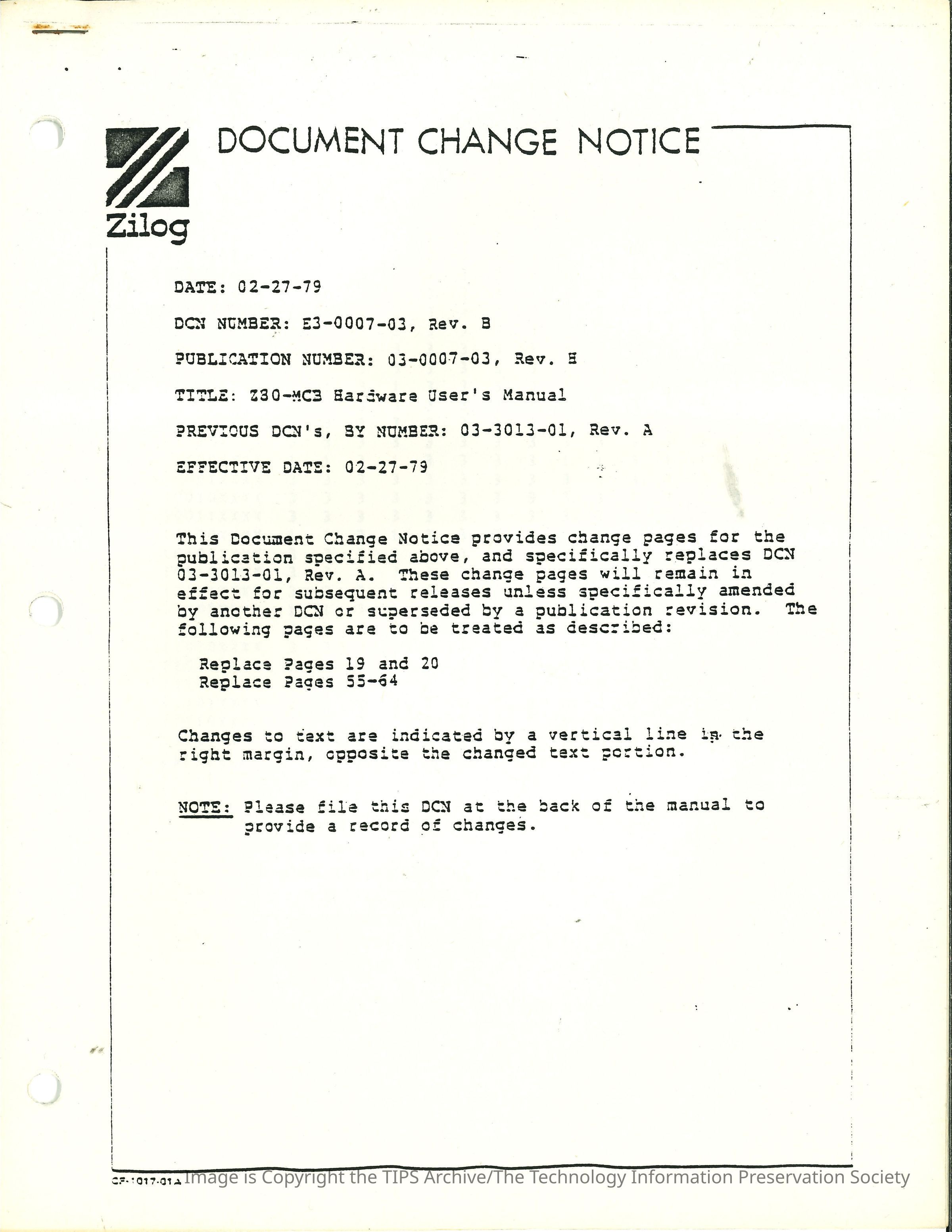 Document Change Notice : Z80-MCB Hardware User's Manual