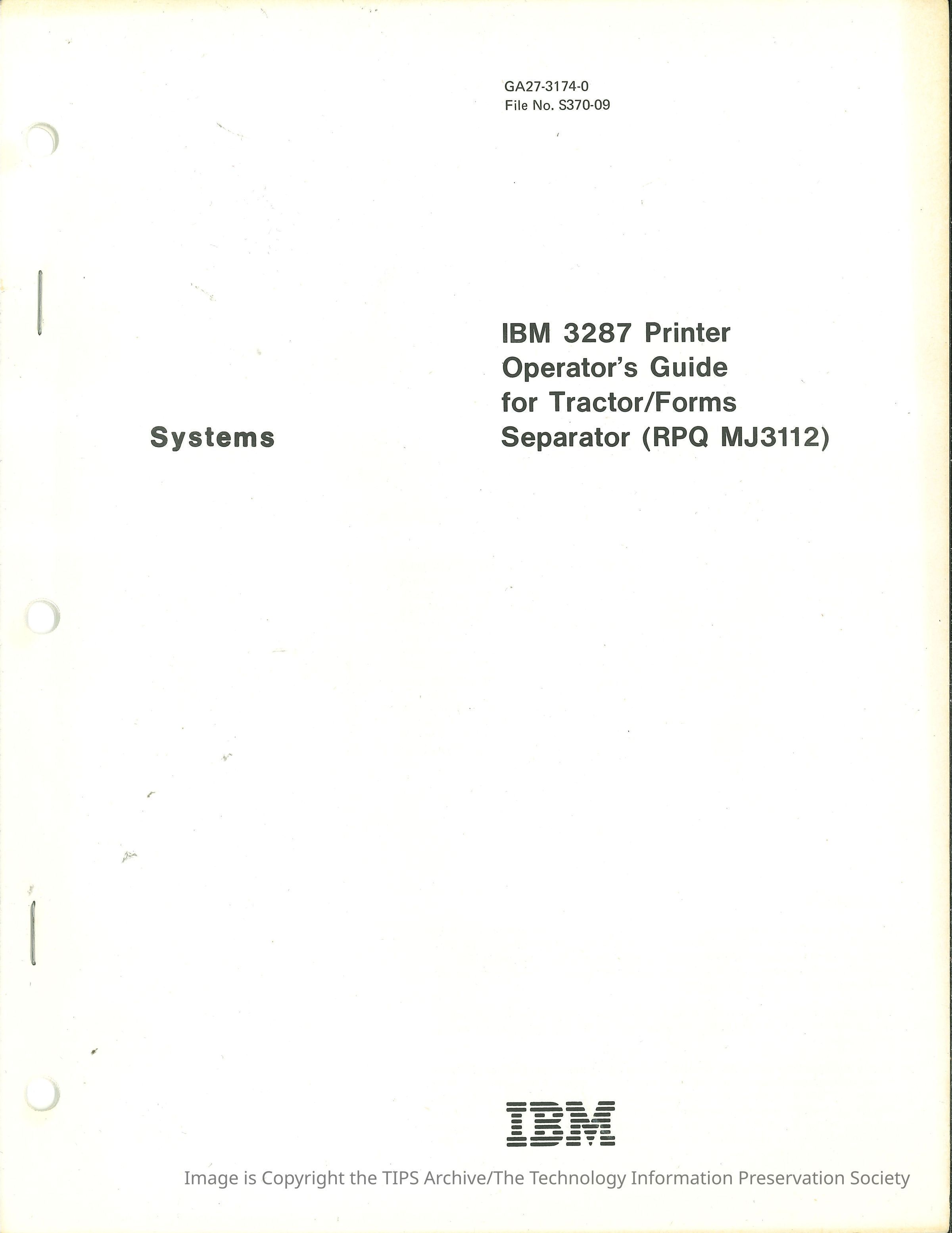 IBM 3287 Printer Operator's Guide for Tractor/Forms Separator (RPQ MJ3112)