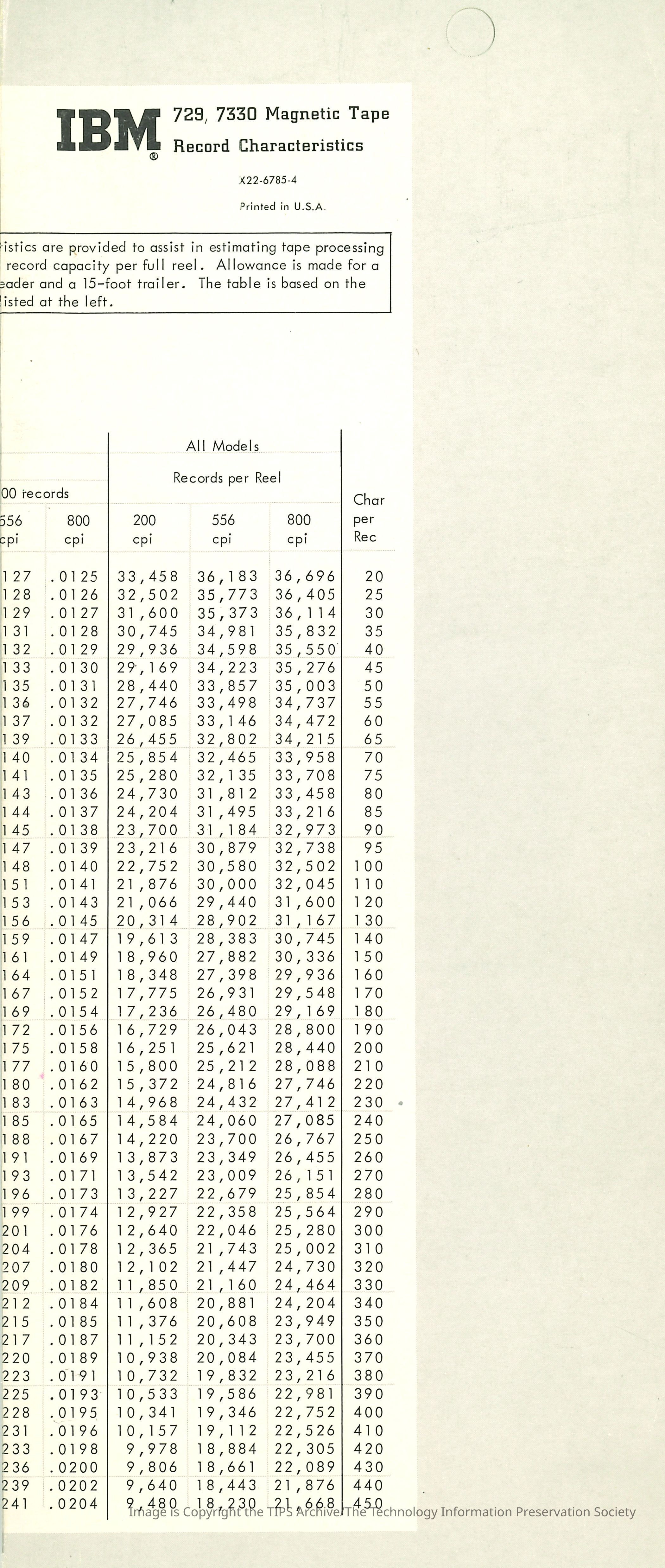 IBM 729, 7330 Magnetic Tape Record CharacteristicsEntry/Object ID