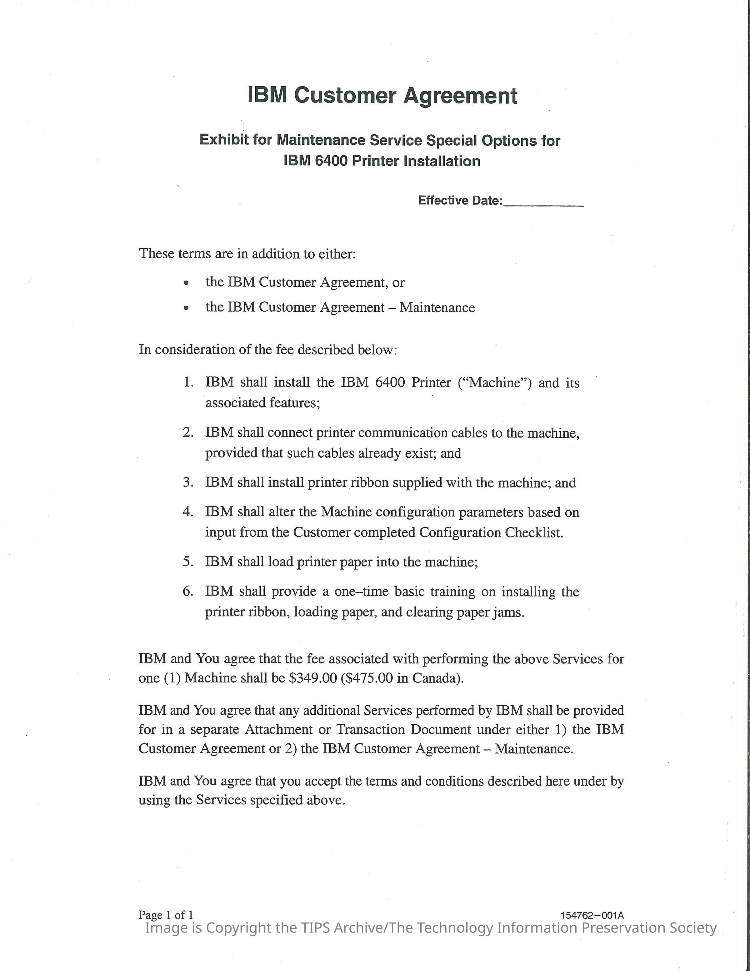 Exhibit for Maintenance Service Special Options for IBM 6400 Printer InstallationDescription