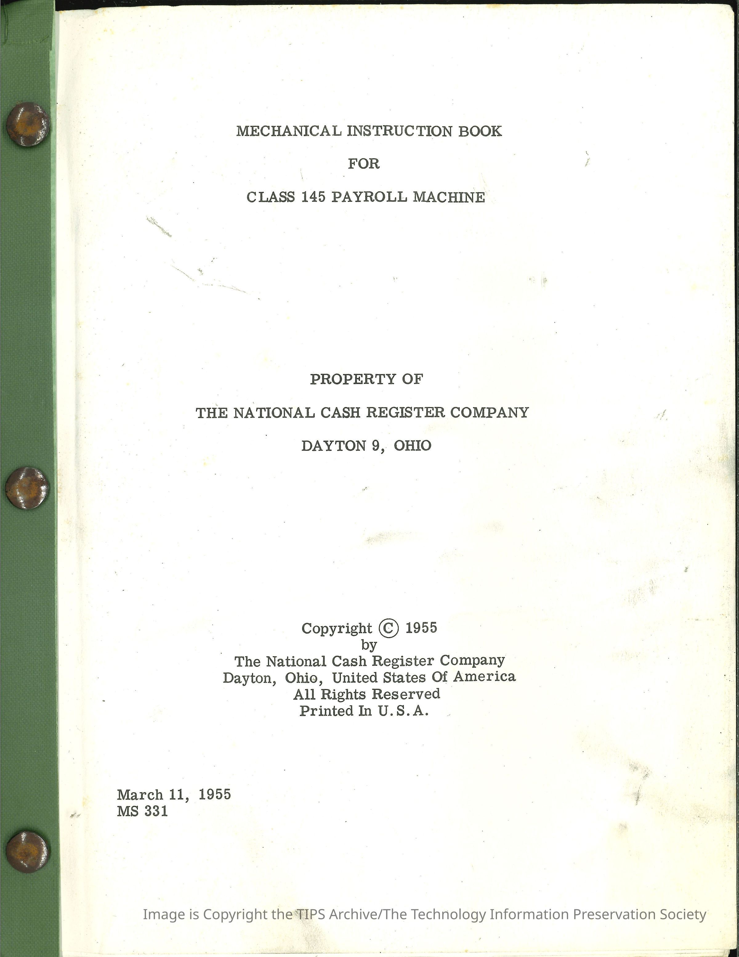 Mechanical Instruction Book for Class 145 Payroll Machine