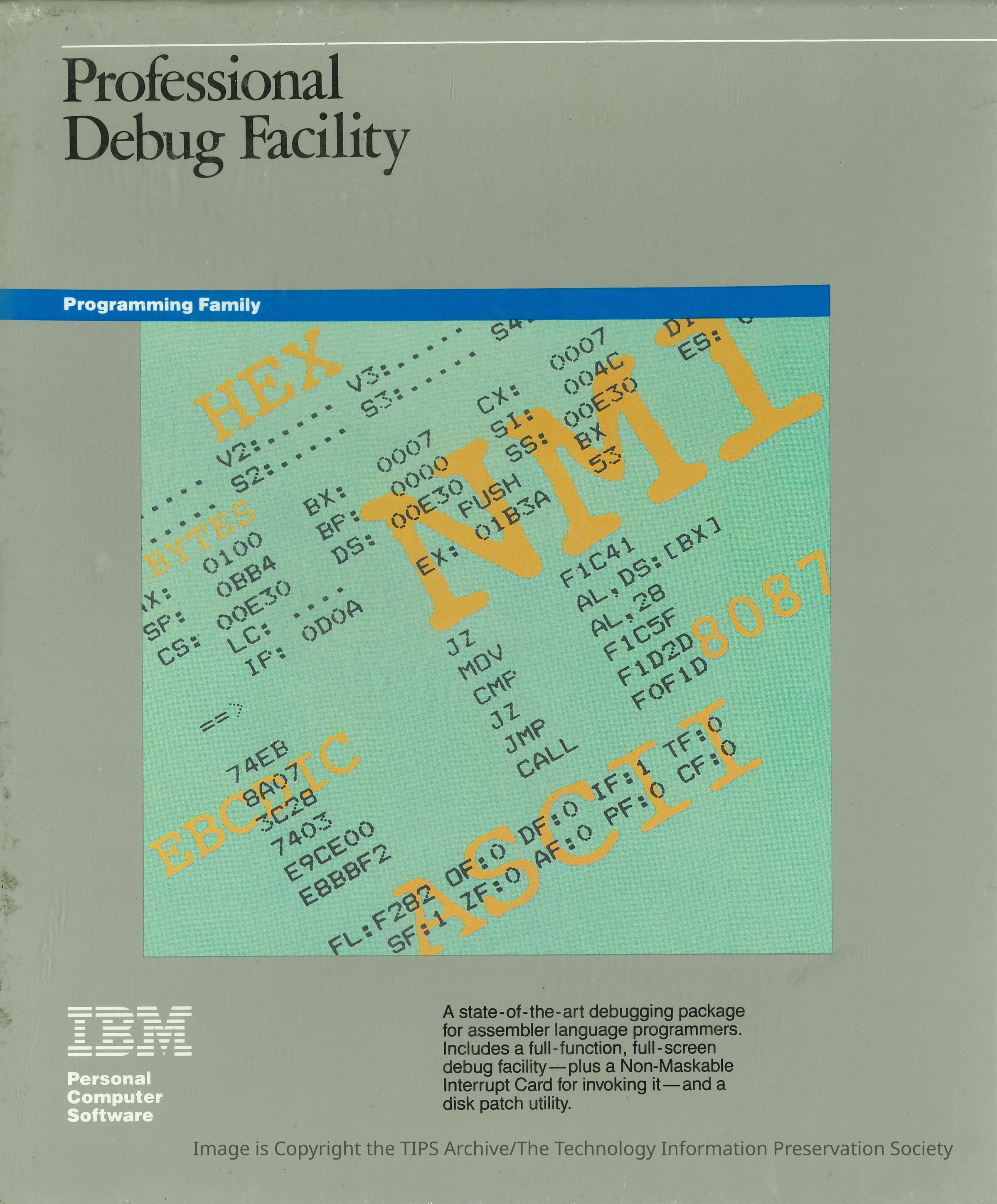 A state-of-the-art debugging package for assembler language programmers. Includes a full-function, full-screen debug facility -- plus a Non-Maskable Interrupt Card for invoking it -- and a disk patch utility.Category