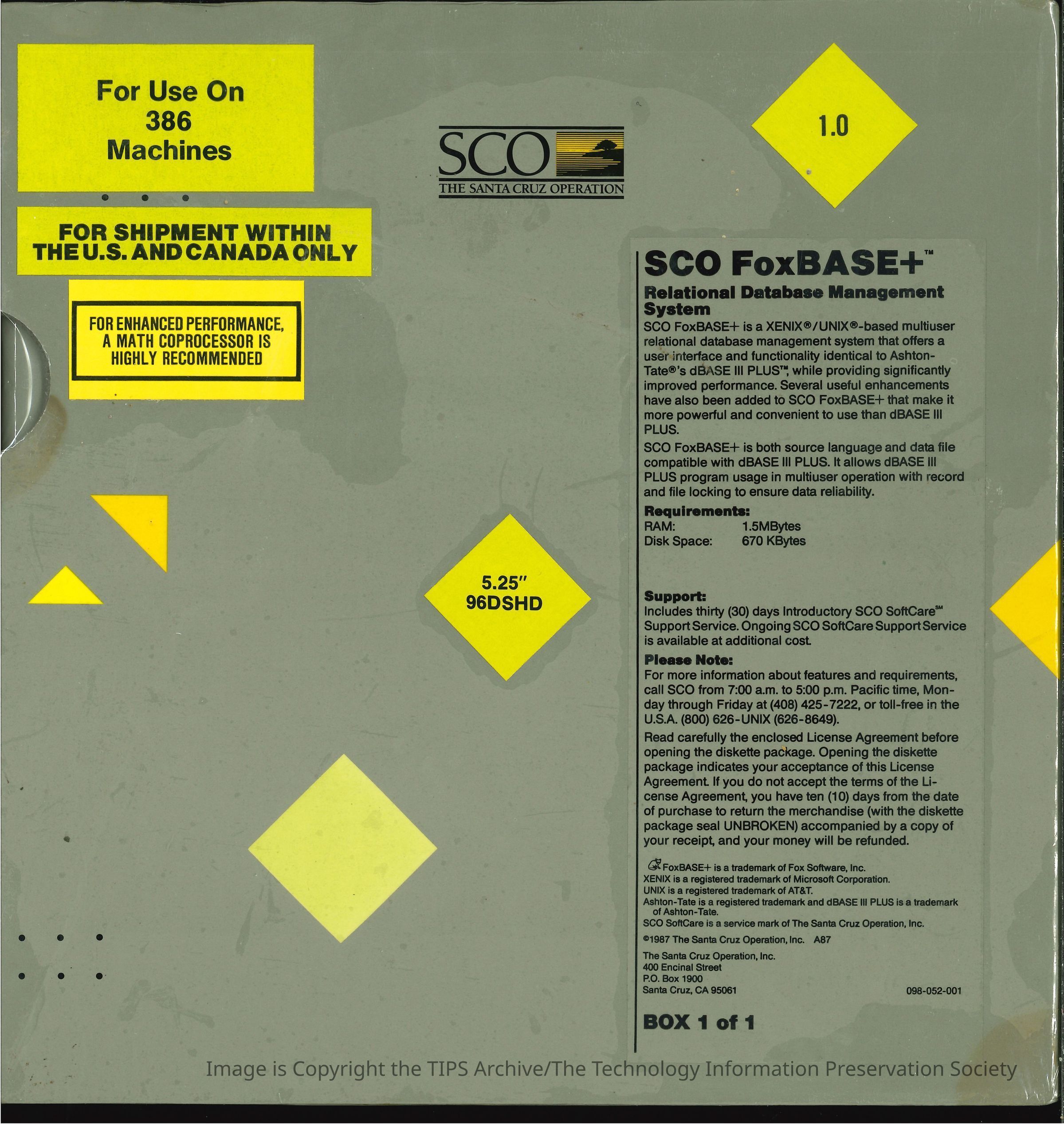 Requires the SCO XENIX or UNIX 386 Operating System, 1.5MBytes of RAM and 670KBytes of fixed disk space.