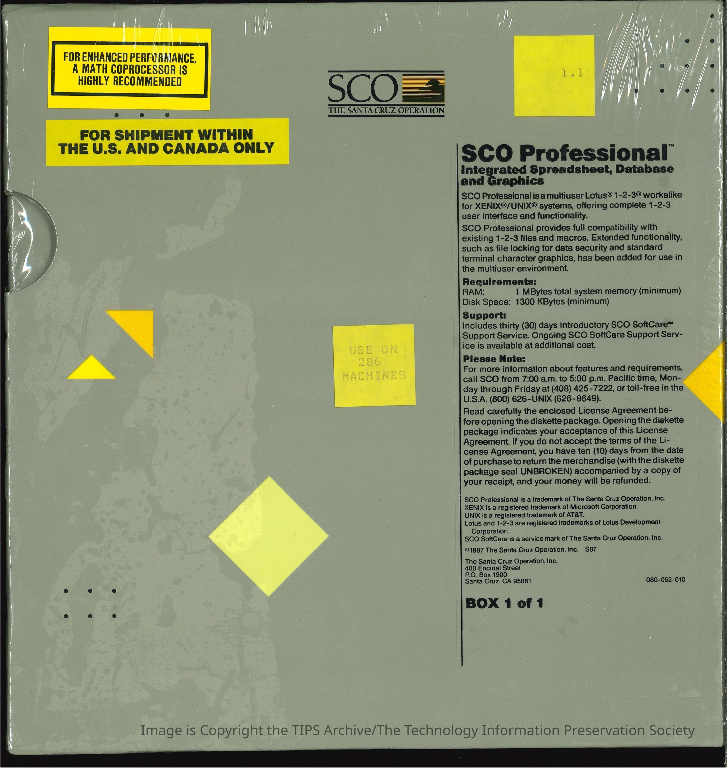 Requires the SCO XENIX or UNIX 286 Operating System, 1MByte of RAM and 1300KBytes of fixed disk space.Category