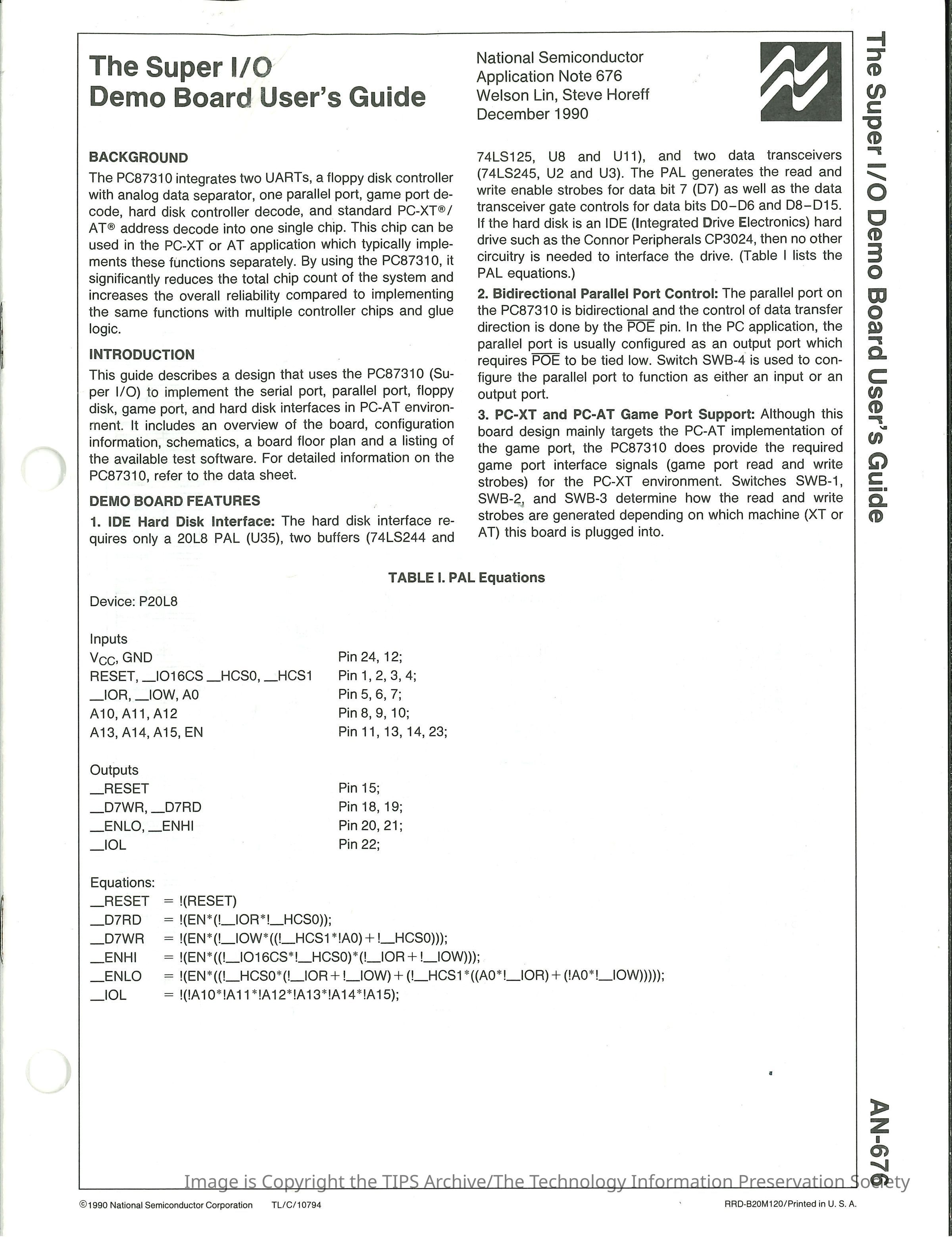 This guide describes a design that uses the PC87310 (Super I/O) to implement the serial port, parallel port, floppy disk, game port, and hard disk interfaces in PC-AT environment. It includes an overview of the board, configuration information, schematics, a board floor plan and a listing of the available test software.Category