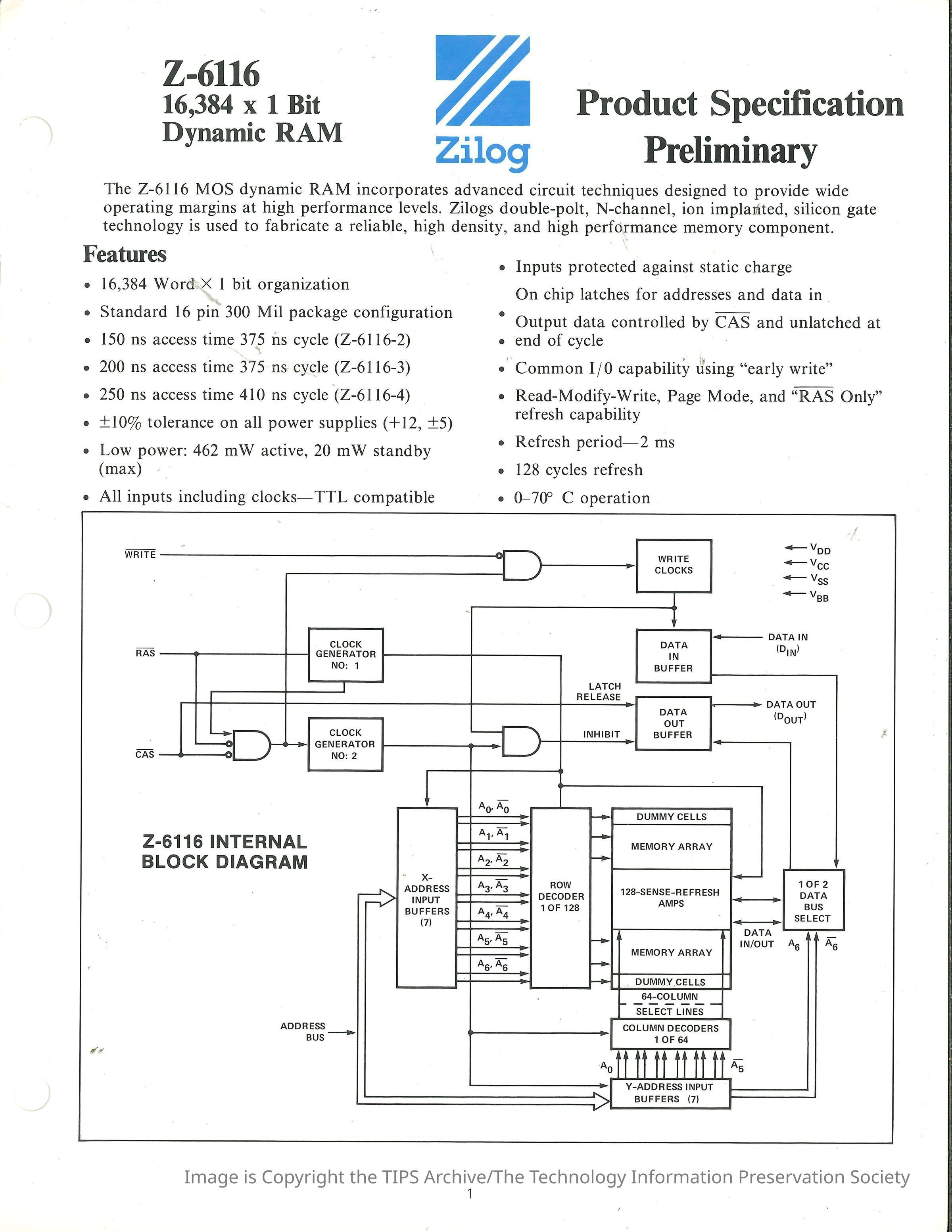 Z-6116 16,384 x 1 Bit Dynamic RAM : Product Specification