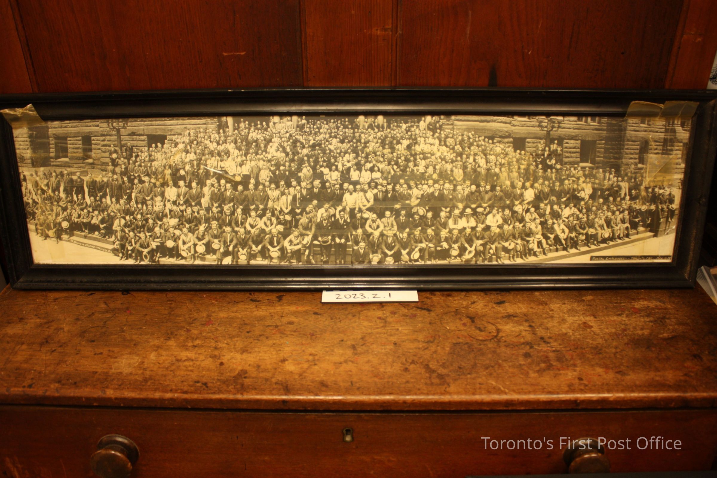 A black and white photo of the postal employees of Toronto in June 1924. A large group of men standing in front of a building. The wooden frame is a bit worn, but mostly in good shape. The glass in the frame is covered in tape.Dimensions