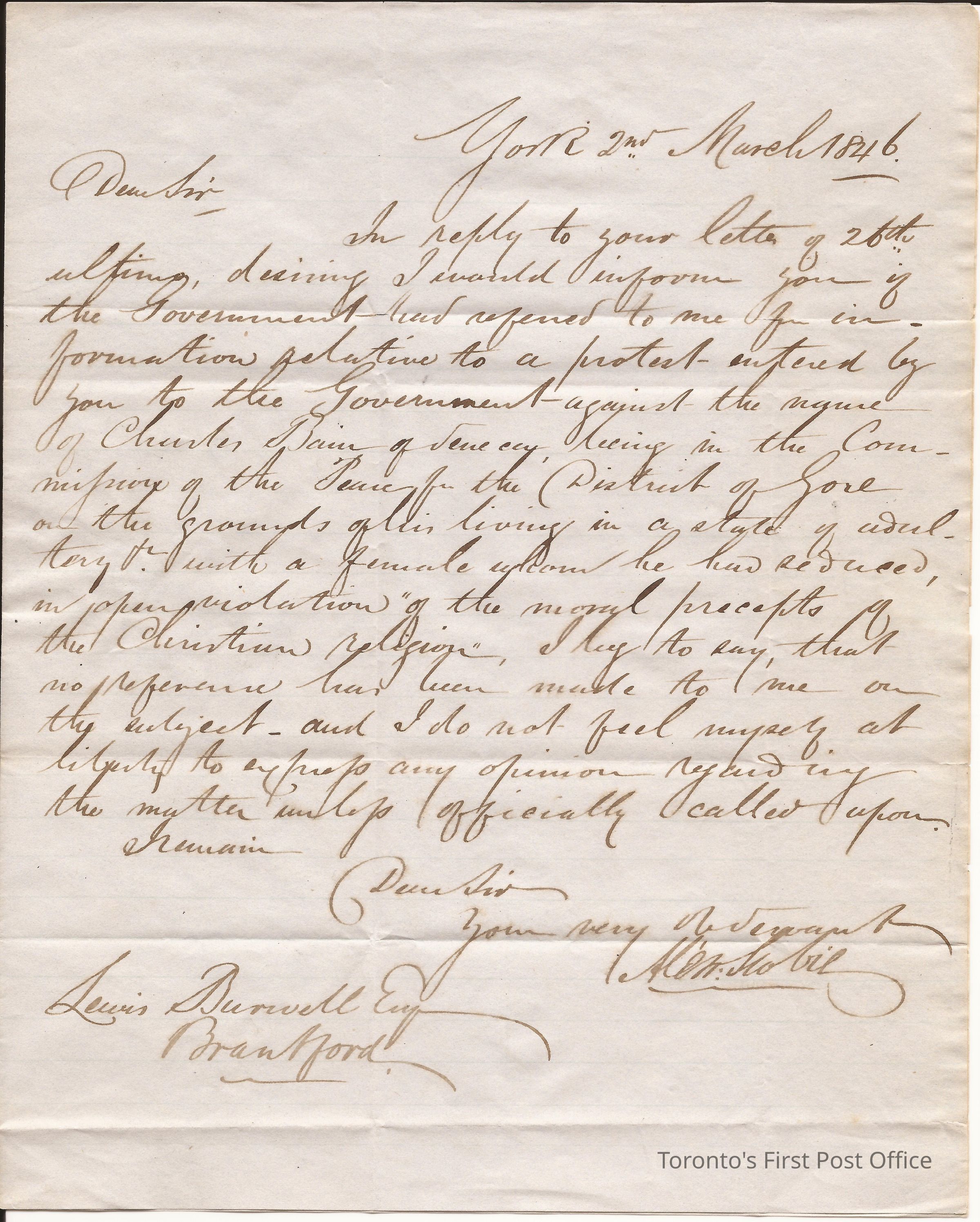 Black ink; pastel green paper with blue ruled lines; written on half a page; green wafer seal; addressed to Lewis Burwell, Brantford; from Alex Scobie, York; dated: March 2, 1846; A. Scobie does not feel he should express opinion of Charles Bain of Seneca living in a state of adultery with a female; two date stamps (York and Toronto).Dimensions