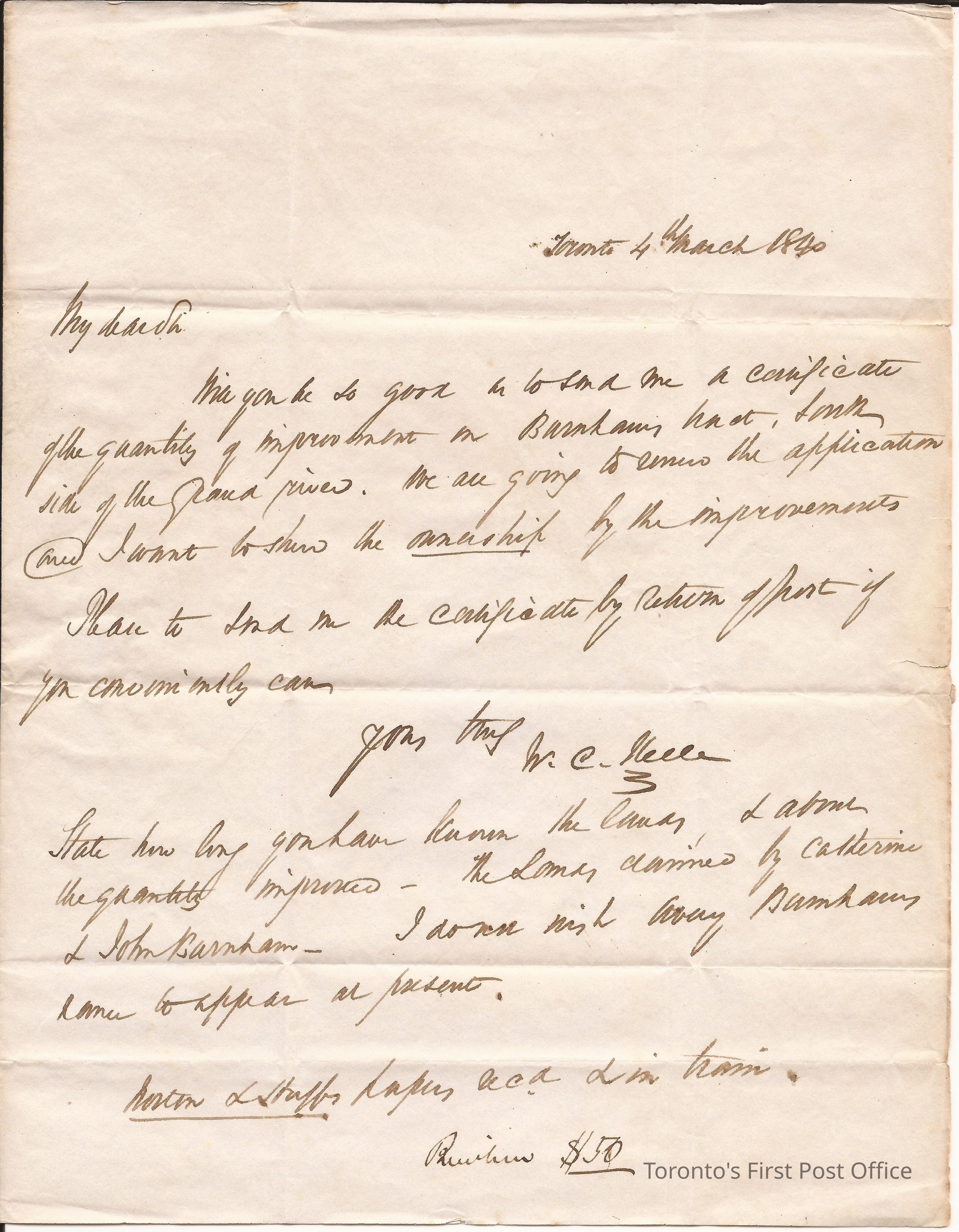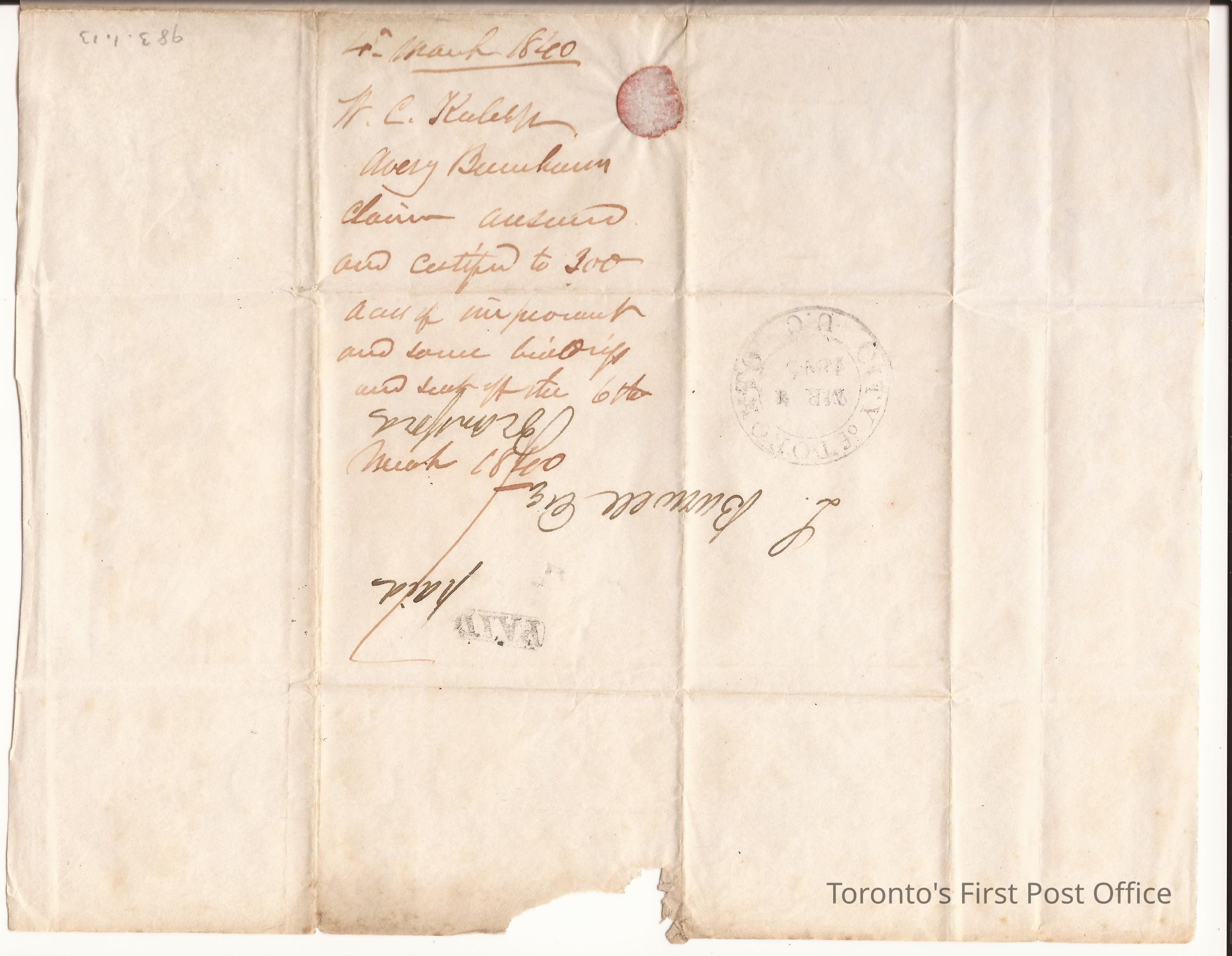 Black and red ink; grey/white paper; red wafer seal; addressed to Lewis Burwell, Brantford; from W.C. Keele, Toronto; dated: Toronto 4th March 1840; re: certificate of improvements done on Barnhams tract S side of Grand River, re: future sale of land; postmarks: double, black CITY OF TORONTO MR4 1840 U.C."; black type "PAID", black manuscript "Paid".Dimensions