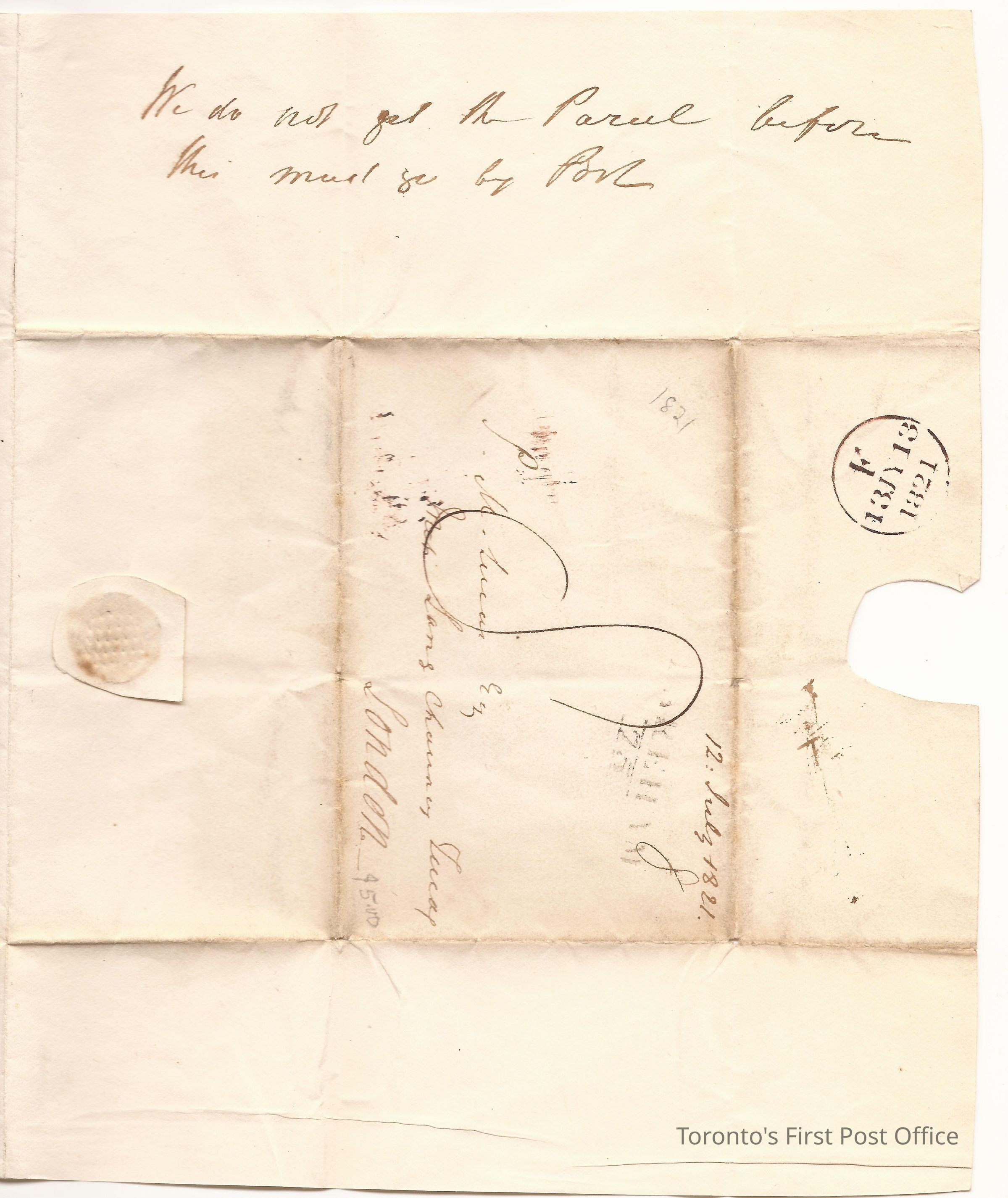 Black wafer seal; watermark "C WILMOTT 1820"; dated: Gafton 12 June, 1821; addressed to PM Lucas Esq., Inc c/o Lang Chauncey Lucas, London; re: trade, duties, going to Gosport, island, to trade or vacation (?); postmarks: 1. manuscript 12 July 1821, 2. single, black British postmarks F 13 JY 13 1821, 3. black type FAREHAM 75.Update Date