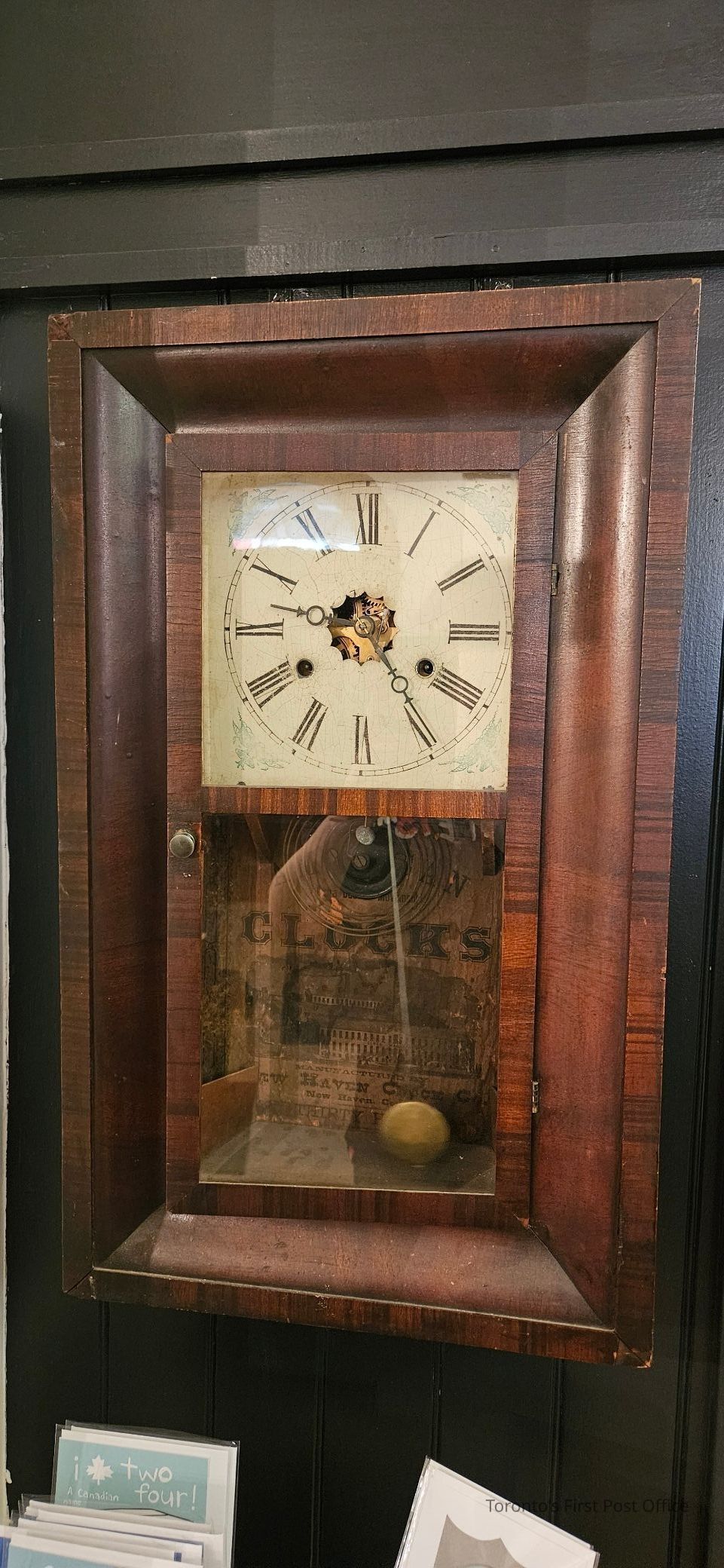 New Haven wall clock; known as an OG clock; dated: circa 1850s - early 20th century; scalloped design allows viewing of brass mechanism; "New Haven Clock Co., New Haven, Conn., Thirty Hours".Dimensions