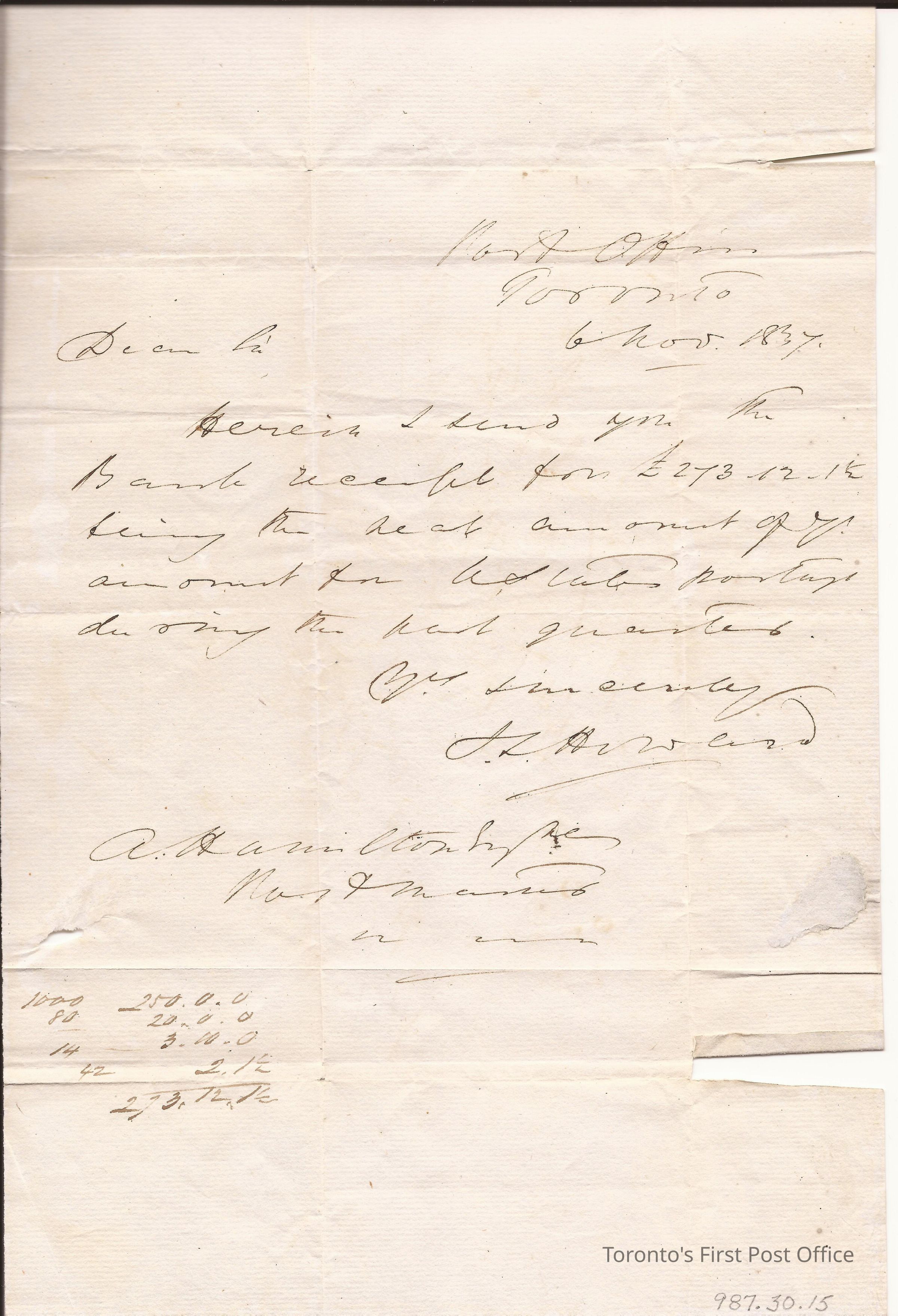 Letter from J.S. Howard, Toronto, to A. Hamilton, Esq., Queenston; 6 Nov 1837; olive-beige paper; folded; postmarks: "City of Toronto No 6 1837, U.C.", "FREE"; watermark.Update Date
