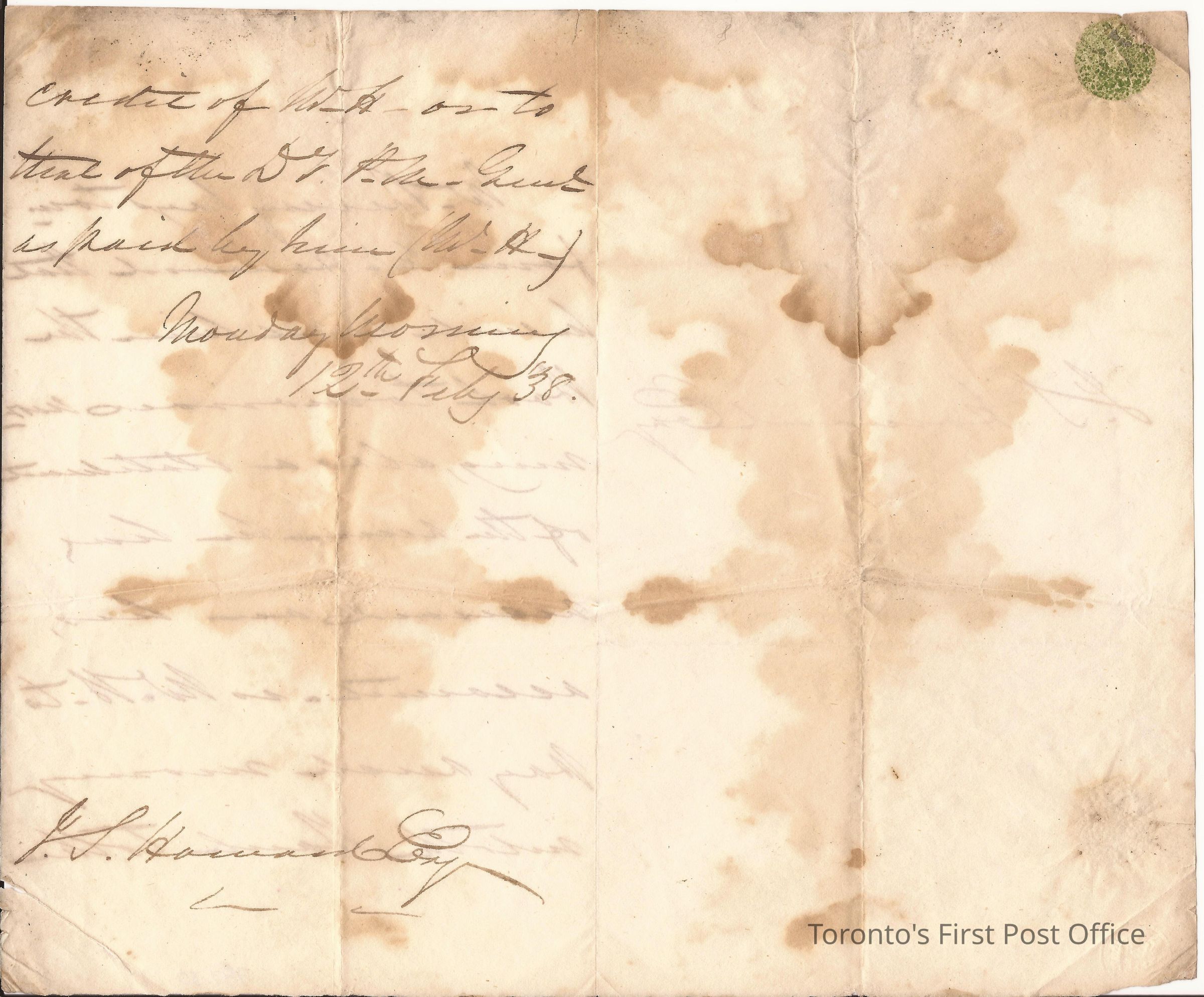 Letter from clerk for Charles Berczy to J.S. Howard, Esq.; Monday Morning, 12 Feby 1838; water-stained, yellowed paper; folded with seal; no postmarks; circular crown impression in bottom left corner.Update Date
