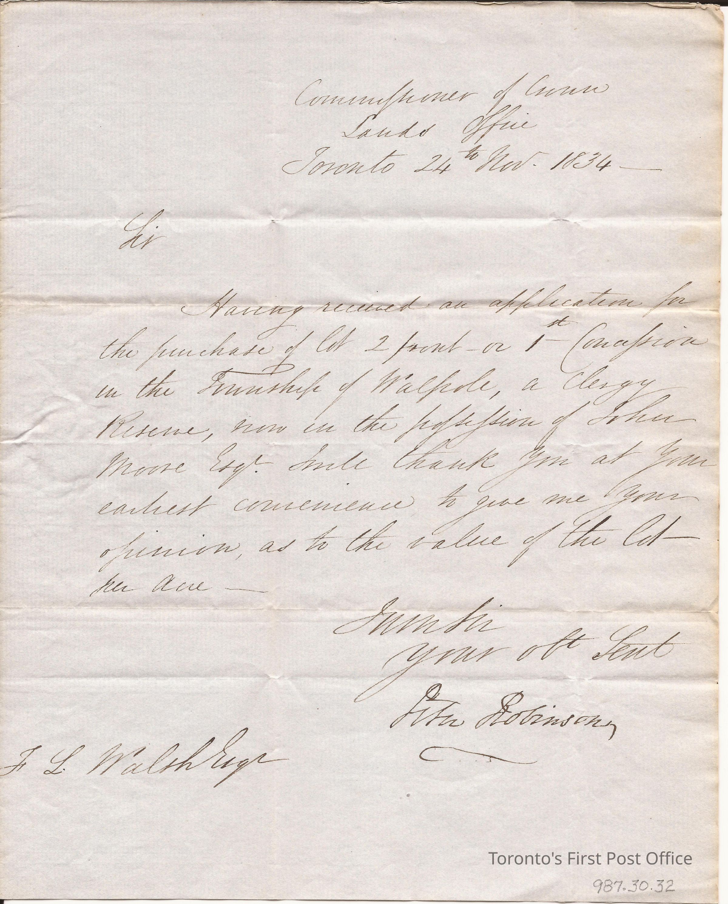 Letter from Peter Robinson, Toronto; to Francis Walsh, Comm. of Crown Lands, Vittoria; dated: Commissioner of Crown Lands Office Toronto 24 Nov 1834; postmarks: CITY OF TORONTO U.C. NO 28 1834; green wafer seal; re: P. Robinson asking Walsh the price of land purchased on 1st Concession Twnsp of Walpole.Dimensions