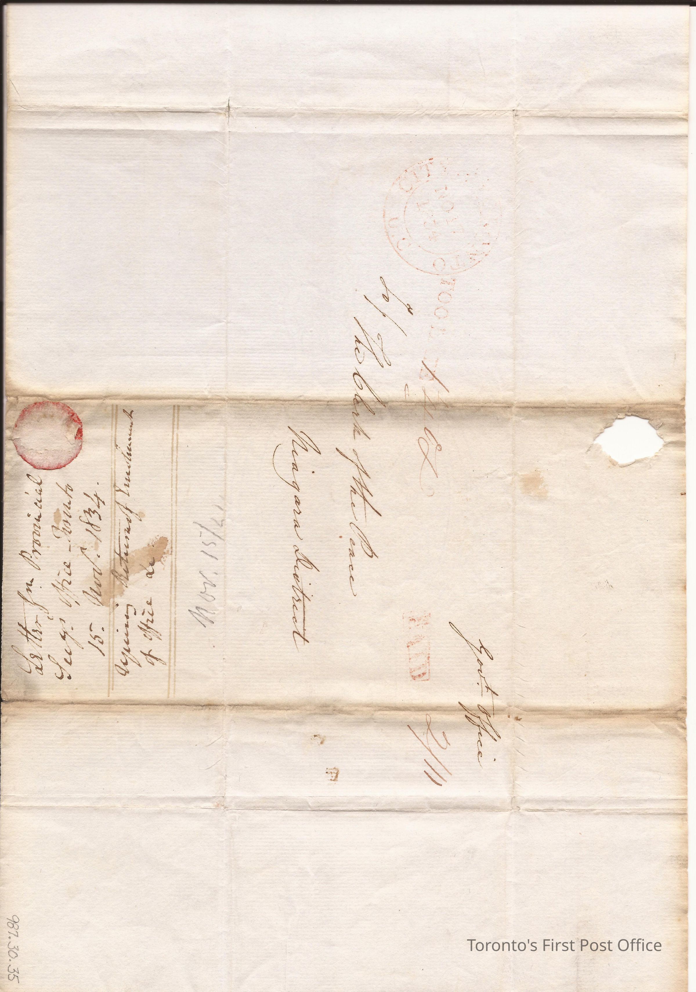 Cover from the Provincial Secretary's Office, Toronto; to the Clerk of the Peace Niagara District; postmarks: "CITY OF TORONTO NO 17 1834 U.C.", "TOO LATE", "PAID"; red wafer seal; watermark: Britannia; laid paper.Update Date