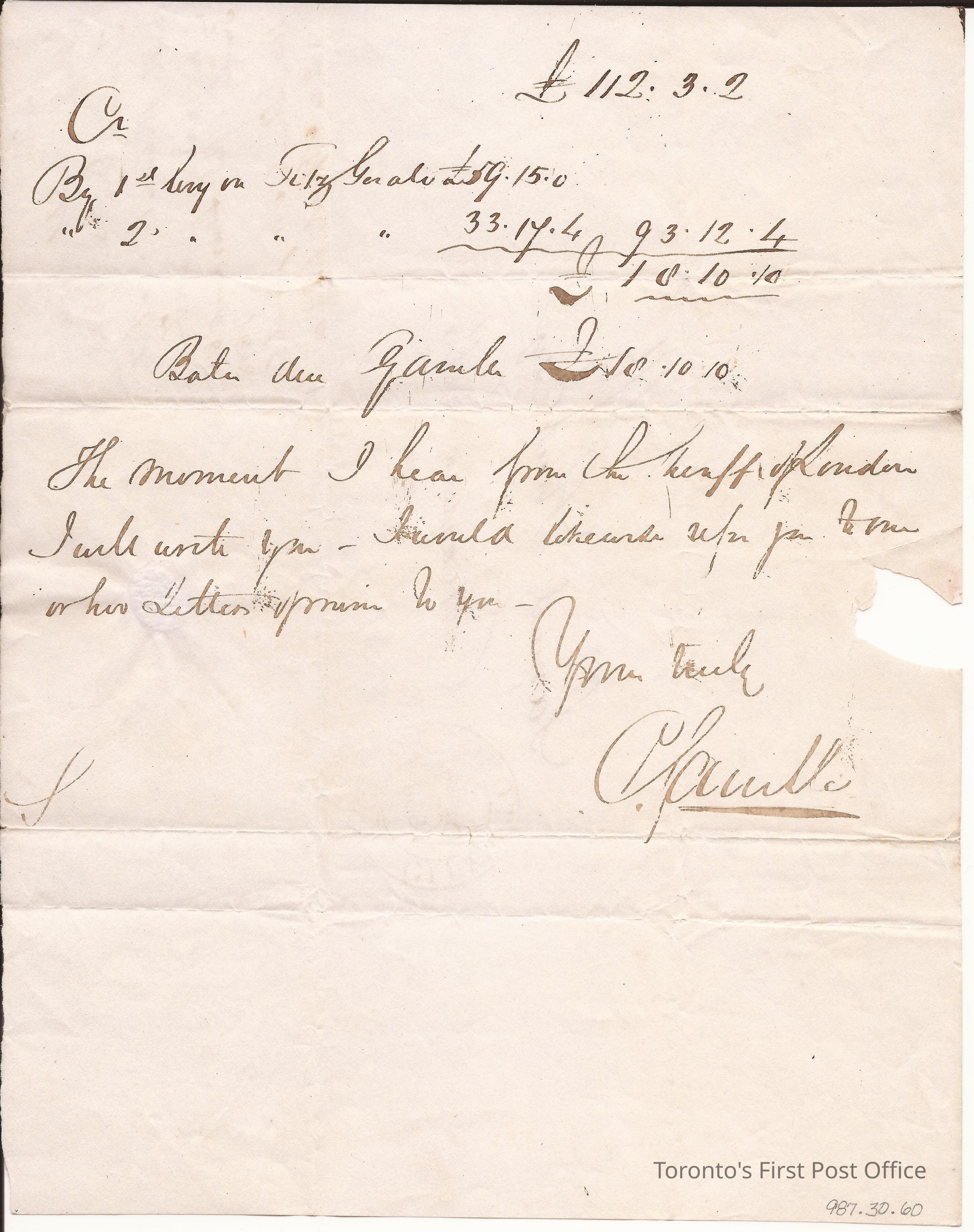 Letter from Clark Gamble, Toronto; to Samuel Street, Niagara Falls, dated: Dec 7 1838, red wafer seal; postmarks: "CITY OF TORONTO DE 7 1838"; re: accounting figures balance due to Gamble of £10.10.10; half a page only; unbleached paper.Update Date