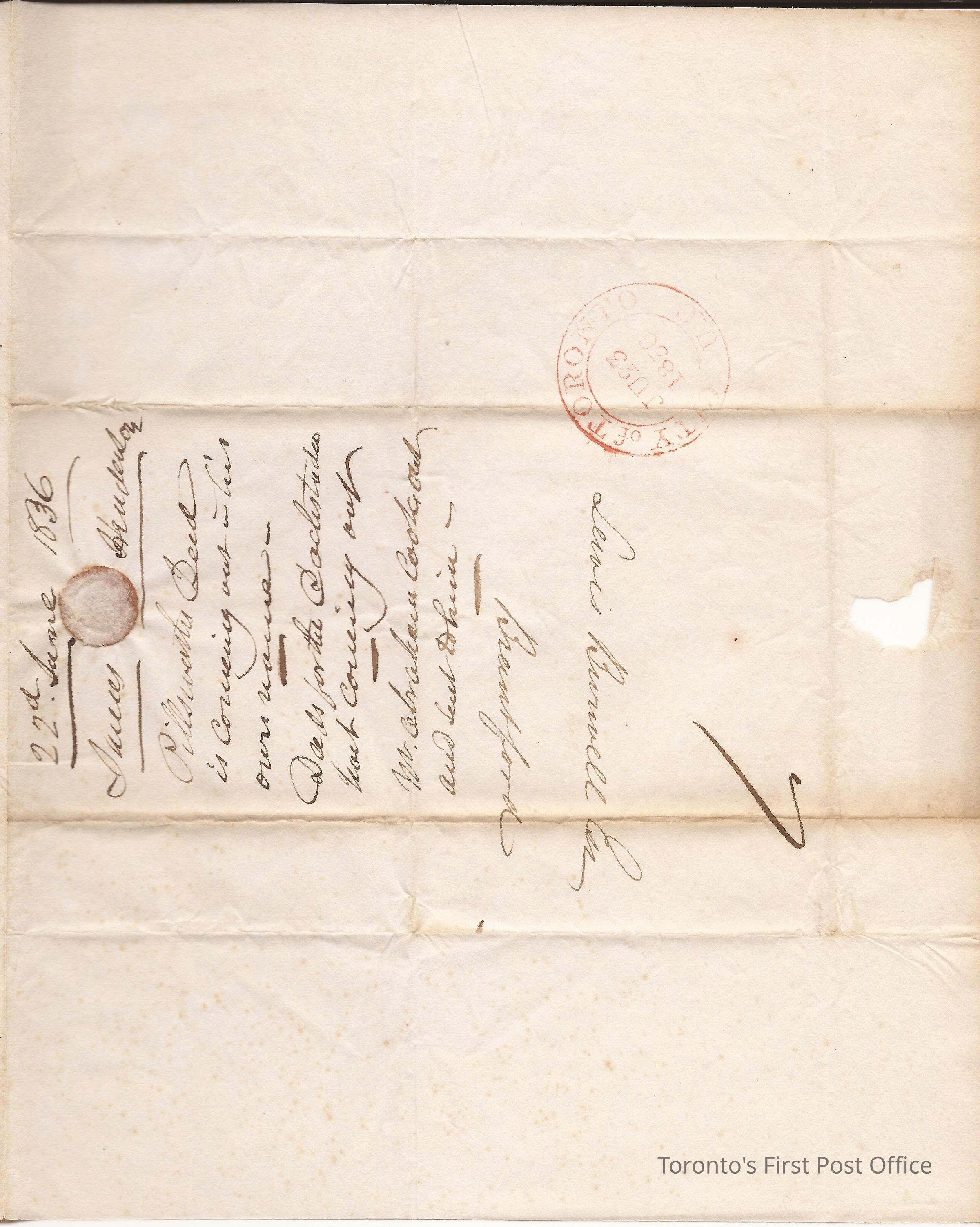 Letter from James Henderson, Toronto; to Lewis Burwell, Brantford; dated: 22 June, 1836; postmarks: "CITY OF TORONTO U.C. JU 23 1836"; postage: "7"; red wafer seal; re: deeds for town lots to be completed and registered, election news; unbleached, crisp paper.Update Date