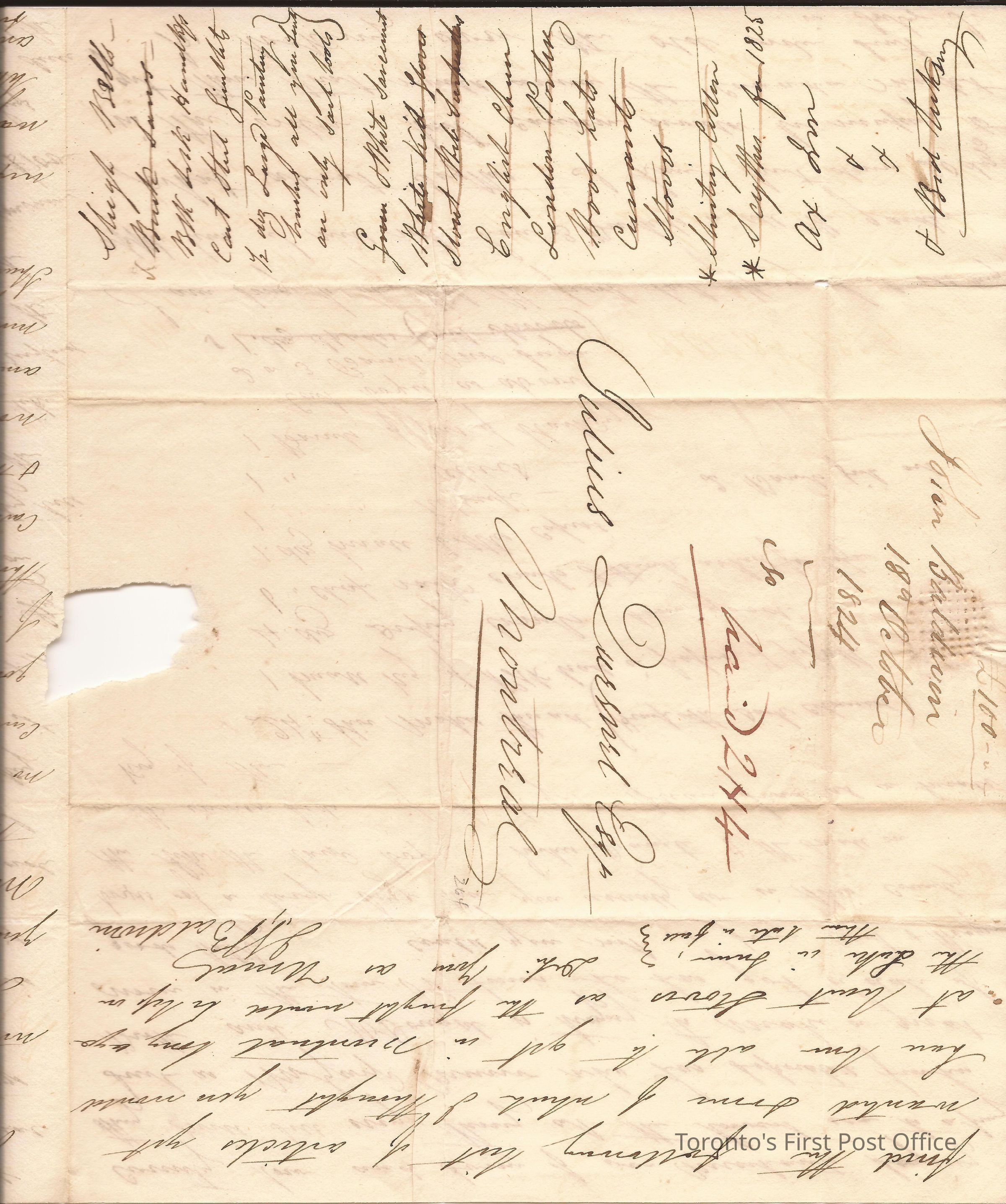 Letter from John S. Baldwin, York; to Julius H. Quesnel, Montreal; dated: 18 October 1824; postmarks: "Paid 2H4" in red ink; watermark: "H CRICHTON 1821"; yellow wafer seal; re: reference to the specific of merchandise items were likely in the 1830s.Update Date