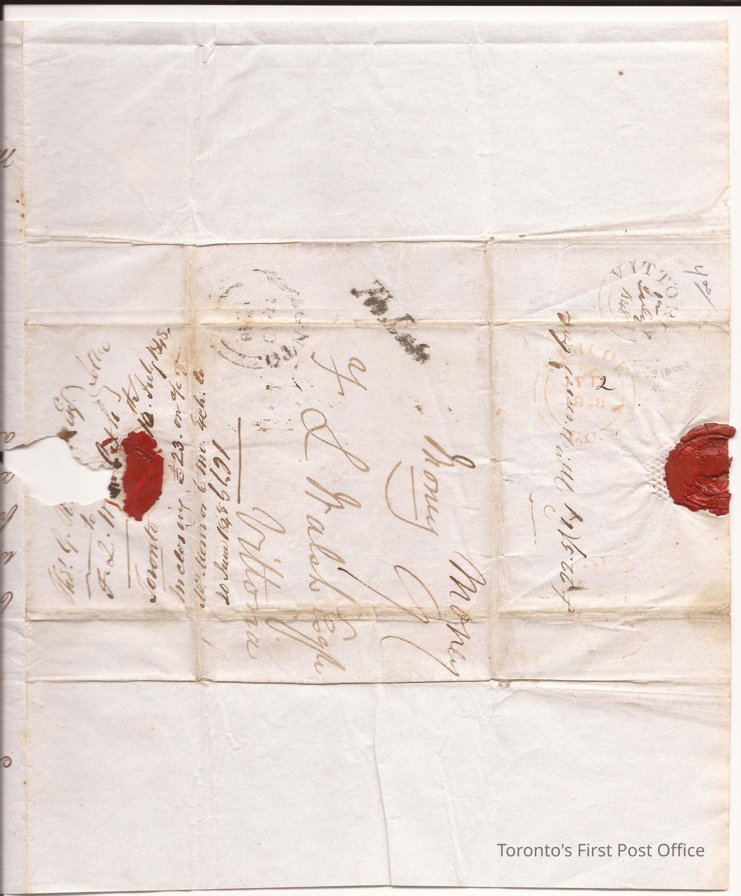Letter to F.L. Walsh Esq., Vittoria; from Thos. G. Ridout, Cashier; dated: Bank of Upper Canada Toronto 10 July 1848; postmarks: 1. black broken double "… TORONTO JL 10 1848", 2. red broken double "SIMCOE JY 12 1848 U.C.", 3. black broken double "VITTORIA... JULY 1848", 4. red broken double, not decipherable, 5. money letter, 6. black stamp "Too Late"; postage: "9"; unbleached, crisp, laid paper; black ink faded to brown; watermark: shield-like emblem surmounted by a crown below the initials "CA"; red wax seal; re: changing account of Walsh with £24.1.0 from Mrs. Munro.Update Date