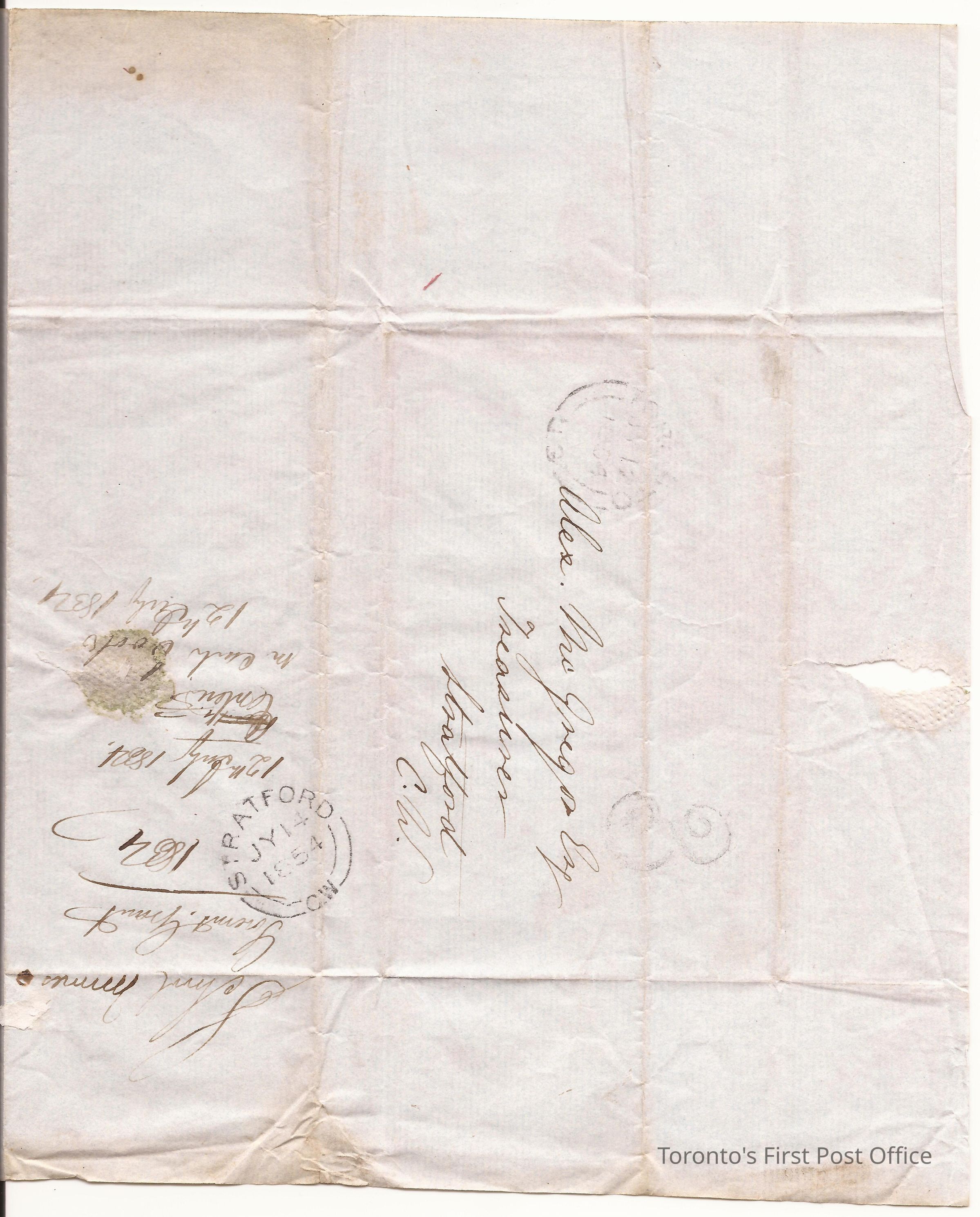 Letter to Alex McGregor Esq Treasurer Stratford C.W.; from Edw Goldsmith Chief Clerk; dated: Bank of Upper Canada, Toronto 12 July 1854; unbleached, crisp, laid paper; black ink faded to light brown; watermark: shield surmounted by crown and initials "S(or L) & Co"; green wafer seal; postmarks: 2. black broken double "TORONTO JY 12 1854 U.C.", 3. black broken double "STRATFORD JY 14 1854 C.W.", postage: black stamp "3"; re: enclosed bank draft #7116 on J.C.W. Daly for £357.9.10.Update Date