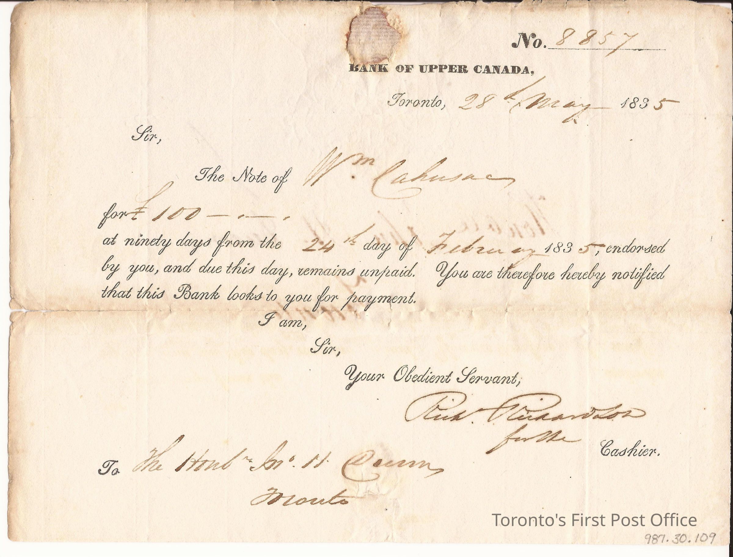 Overdue notice to The Honb. Jno. H. Dunn, Toronto; from the Bank of Upper Canada, Toronto 28 May 1835; re: £100 due at 90 days from 24th Feb 1835 to Wm Cahusac(?); signed Rich Richardson for the Cashier; unbleached, laid paper; black ink fading to brown; watermark: crown surmounting the start of a shield; once had a red wafer seal.Dimensions