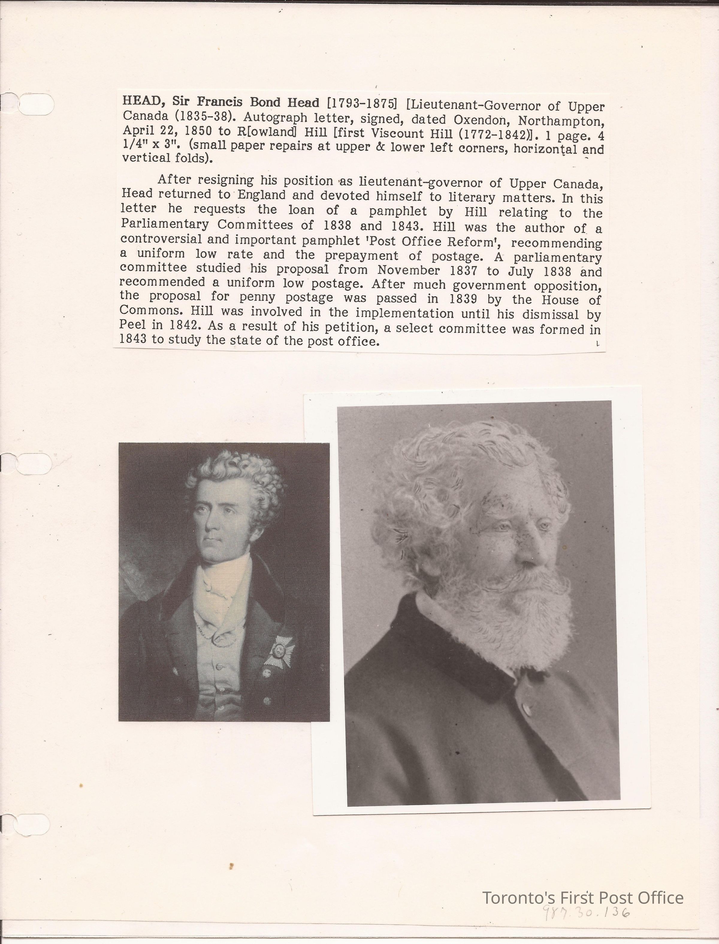 Copy of a photograph of a portrait of Sir. F.B. Head; by Nelson Cook (1817-1892); marked "AP" (artist's proof) 1837; inscribed: "Painted by Nelson Cook, Esquire"; engraved by C. Turner, ARA "HIS EXCELLENCY SIR FRANCIL BOND HEAD, BART; K.C.H. Lieutenant Governor of Upper Canada"; plated printed by Frederick Chase Capreal; published Octr 10 1837.Update Date