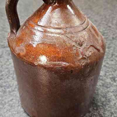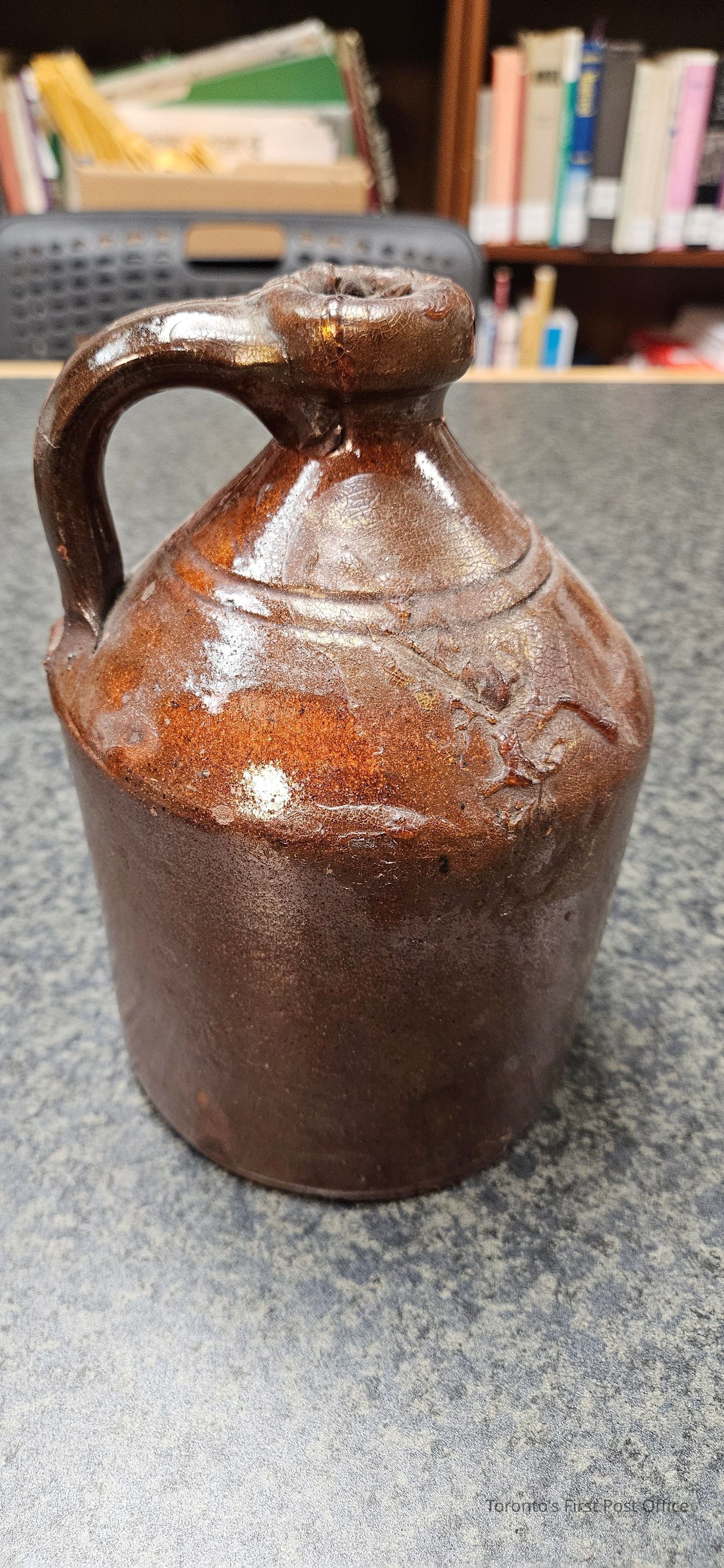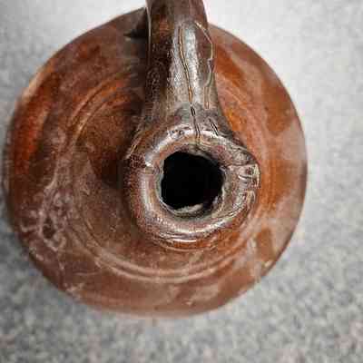 Glue crock; clay/pottery/earthenware; tapered toward base; handle from just below pouring spout to lip of neck; dark brown glaze; circa 1840.Dimensions