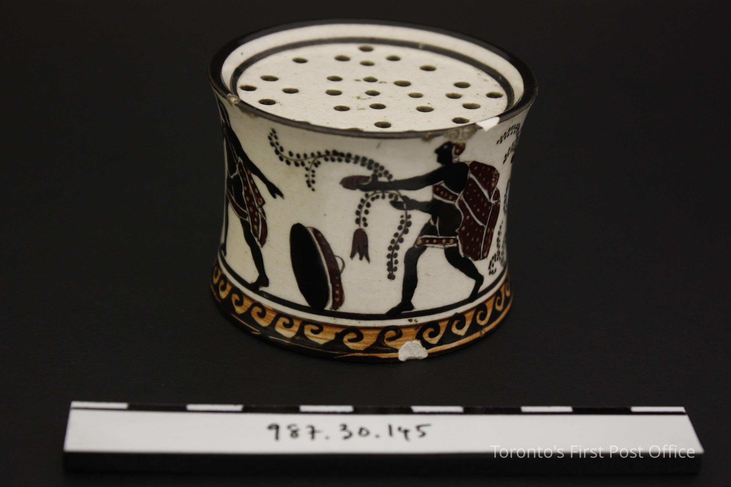 Sander; cylindrical shaped with pinched-in middle; off-white clay; medium brown wave design along bottom of base; black and brown classical motif figures; circa 1820; holes in top.Dimensions