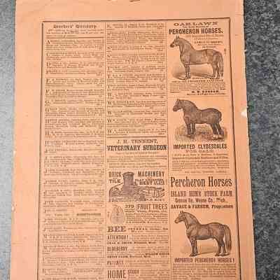 Book: "The Farmer's Advocate and Home Magazine Vol. XX January 1887"; publisher: "London, Ontario Canada, William Weld, Editor and Proprietor, Founded in 1866"; a farm magazine-style book; orange part-cover with farm scene including cows, cattle, and sheep in a barnyard; cotton thread bound; unbleached paper; black and white etching; topics include: farm advice, international farm news, entertainment page, advertisements.Dimensions