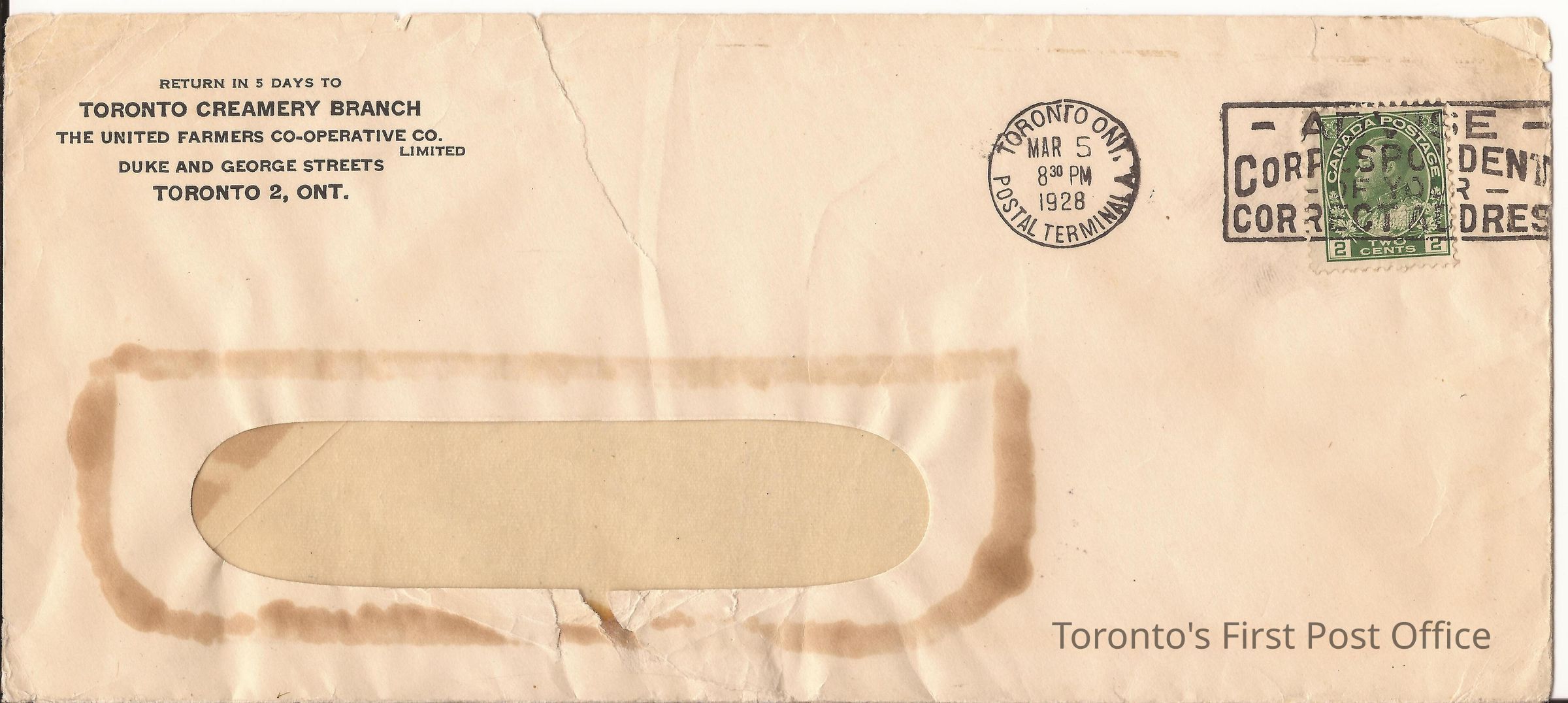 Window envelope; return address printed at top left: "Return in 5 days to Toronto Creamery Branch…"; postmarks: black single "TORONTO ONT. MAR 5 8:30 PM 1928 POSTAL TERMINAL"; postage: 2 cent stamp of George V in green; rectangular canceller; unbleached paper.Dimensions