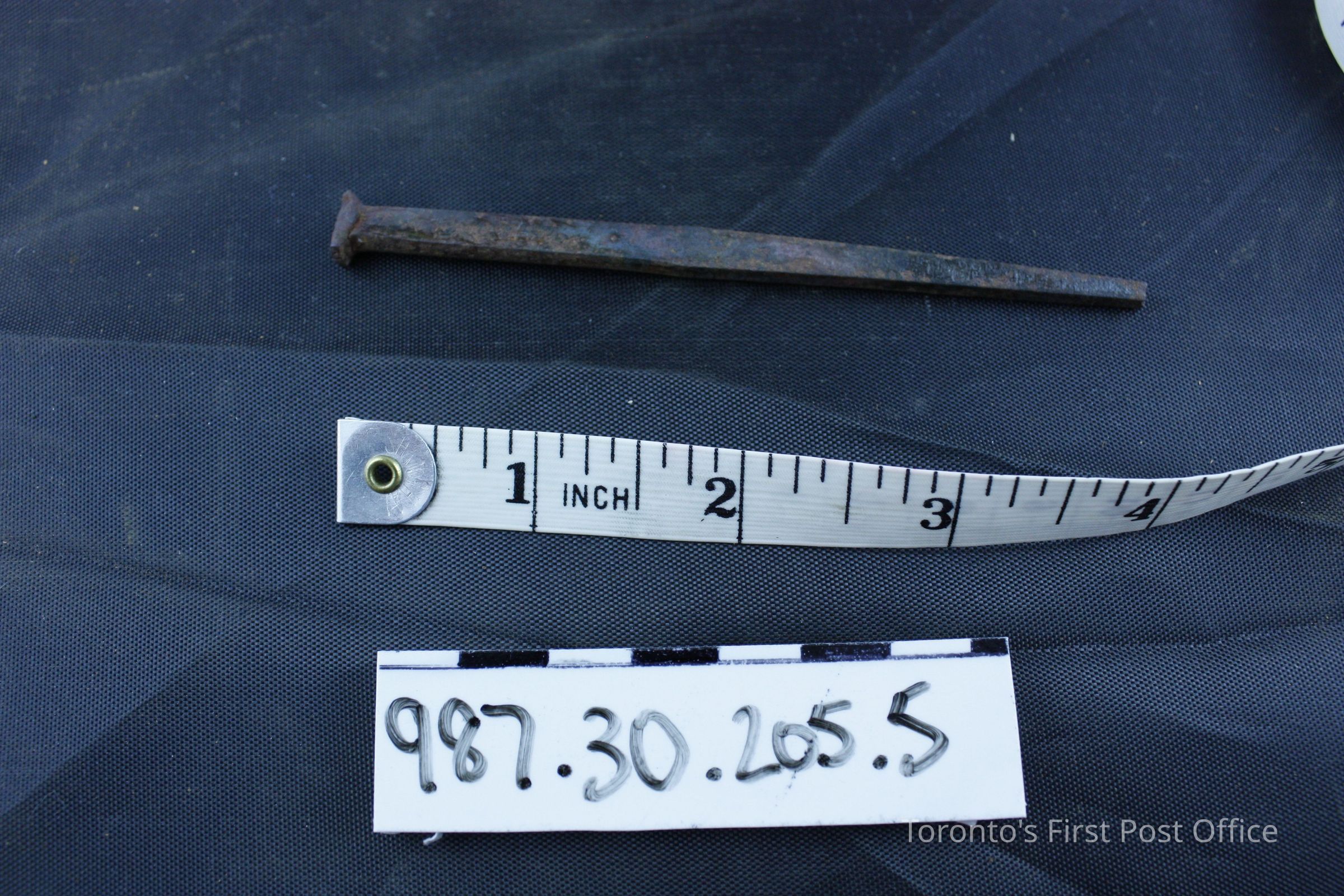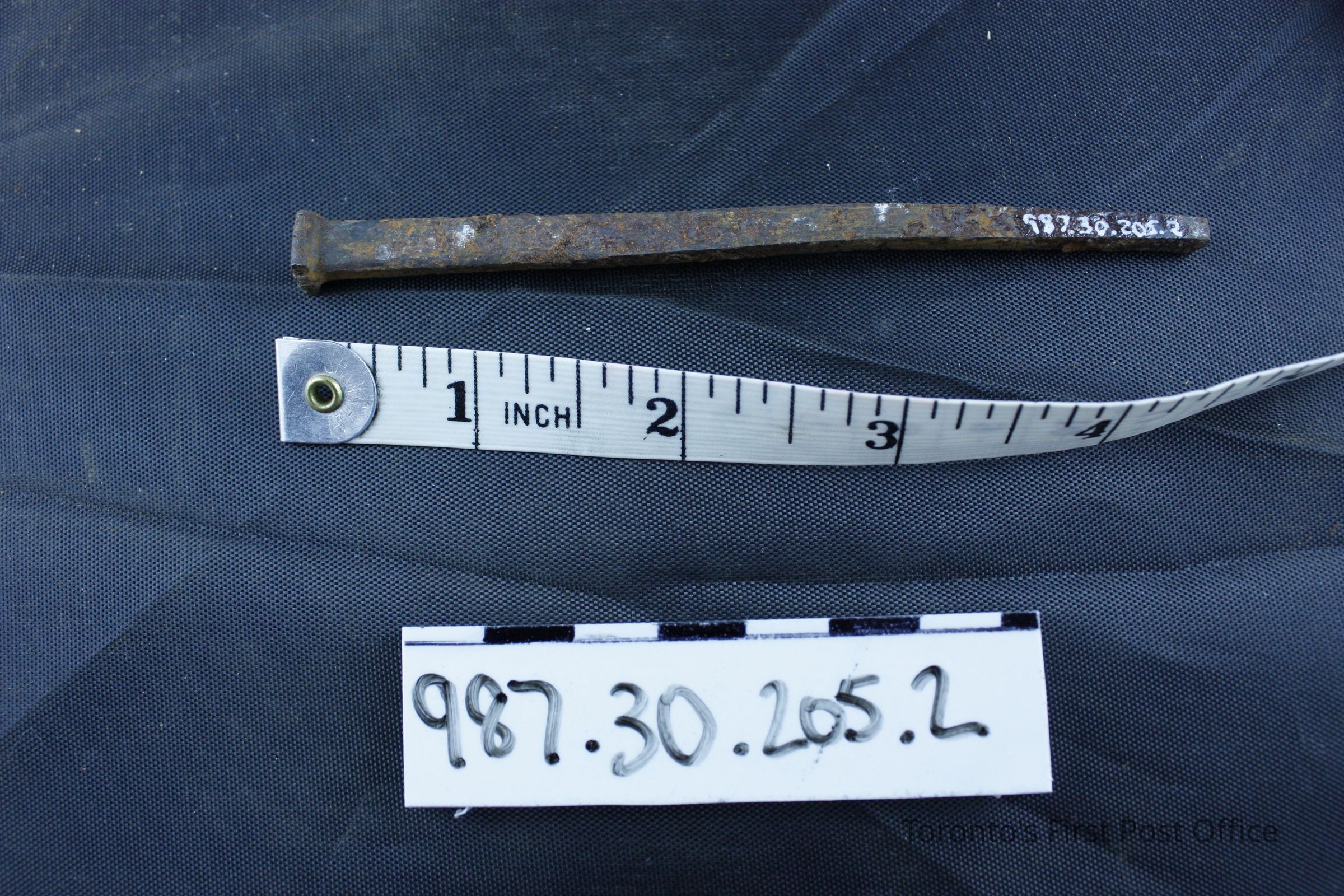 Nails; hand-forged; flattened on two sides; not painted at bottom; iron; excavated; circa 1870.Dimensions