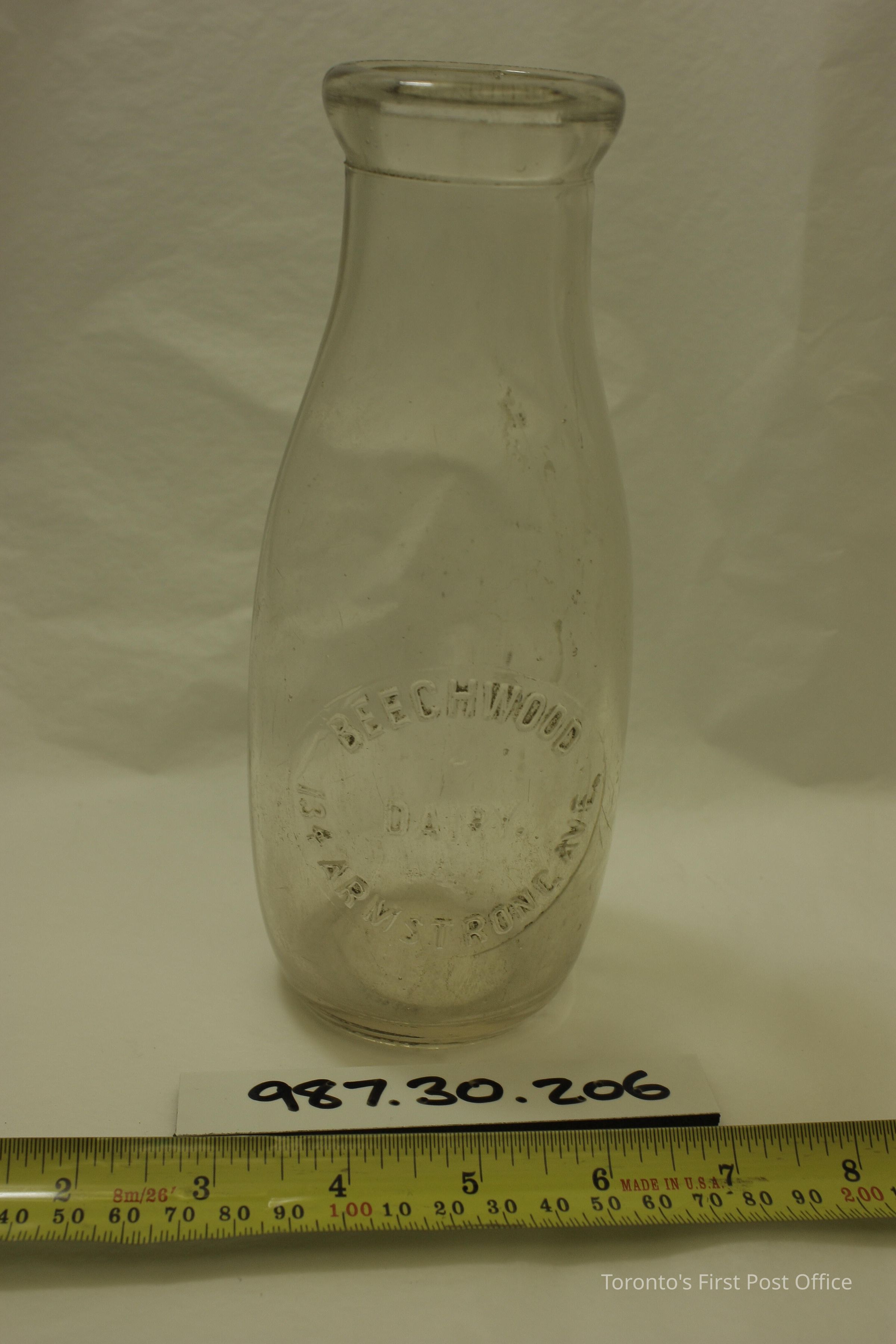 Bottle; for dairy; clear glass with rainbow spots and bubbles; raised inscription on main body in a circle "BEECHWOOD 2 DAIRY 134 ARMSTRONG AVE."; two seams running the length of bottle; circa 1930.Dimensions