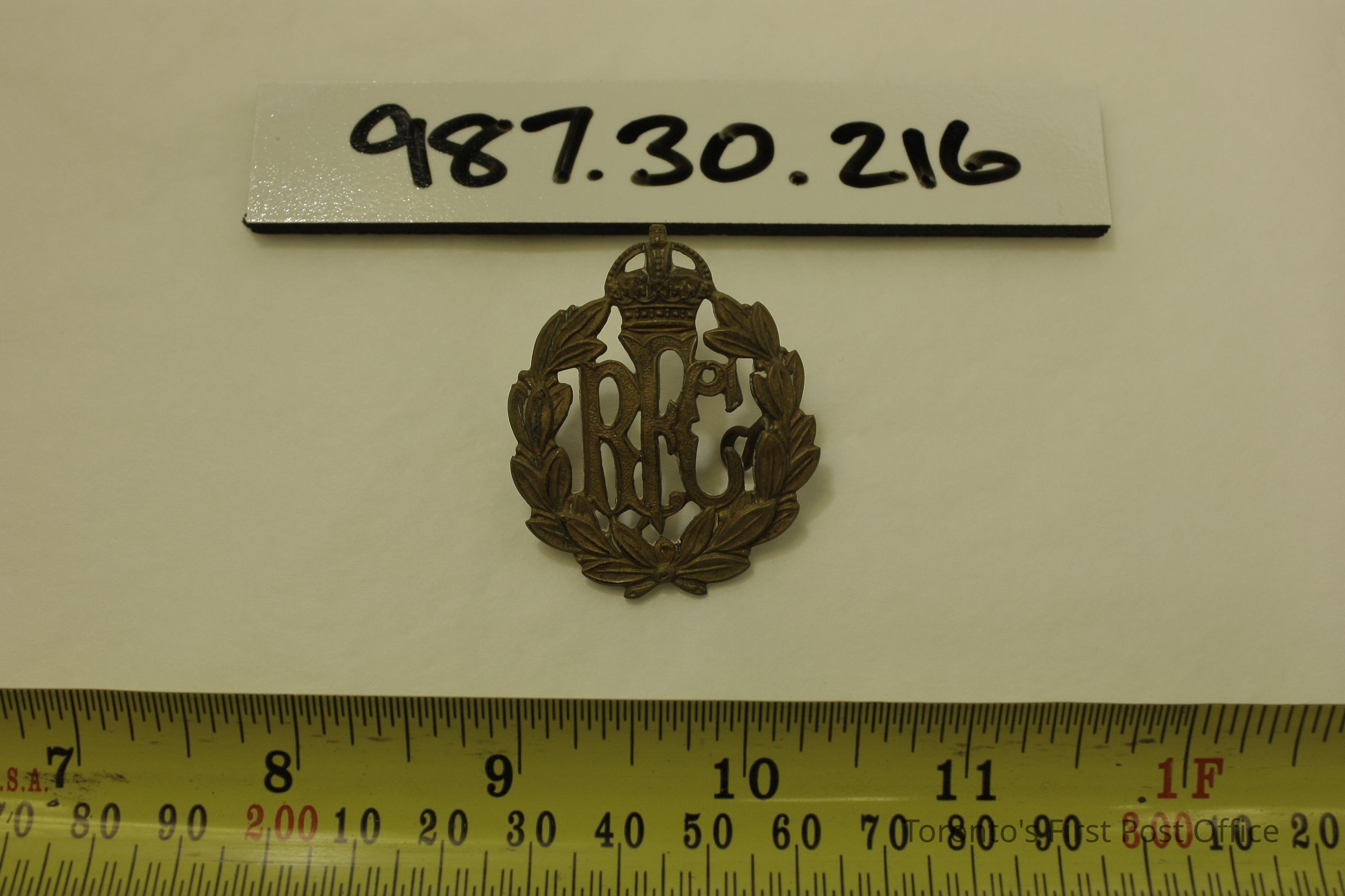 Brass cap badge; "RFC" within wreath, topped by crown (Royal Flying Corps); inscription on reverse: "Roden Bros. Toronto"; circa 23 June 1914.Update Date