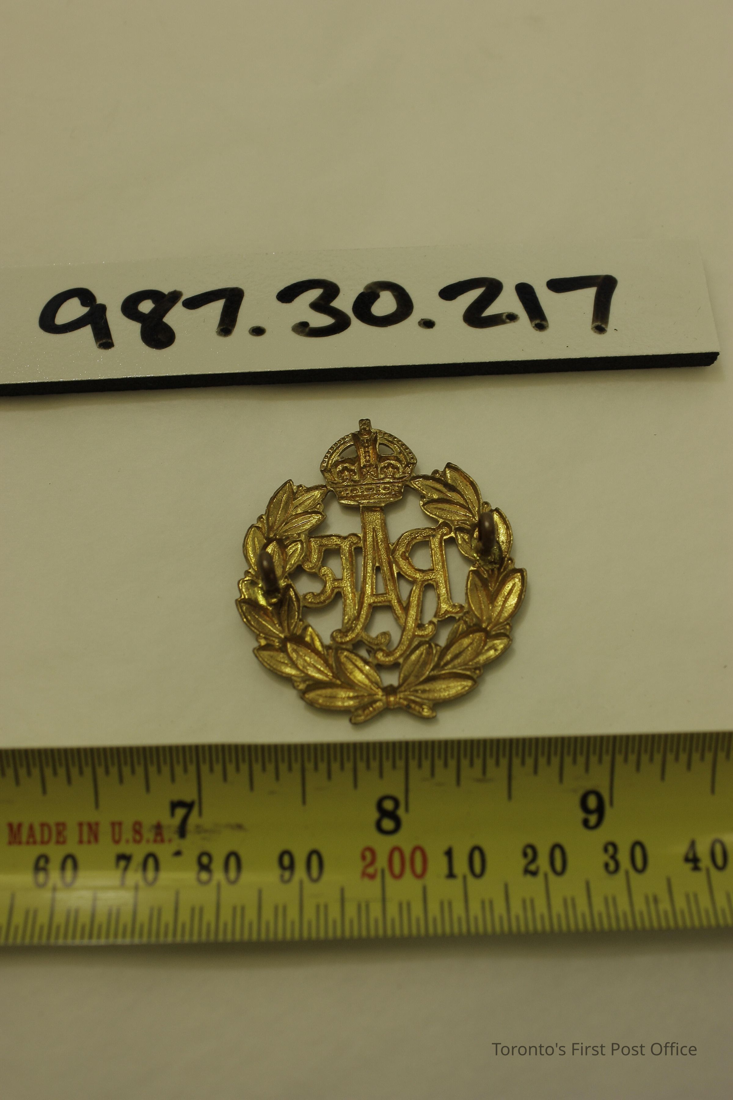 Brass cap badge; "RAF" within wreath, topped by crown (Royal Air Force); circa 1918.